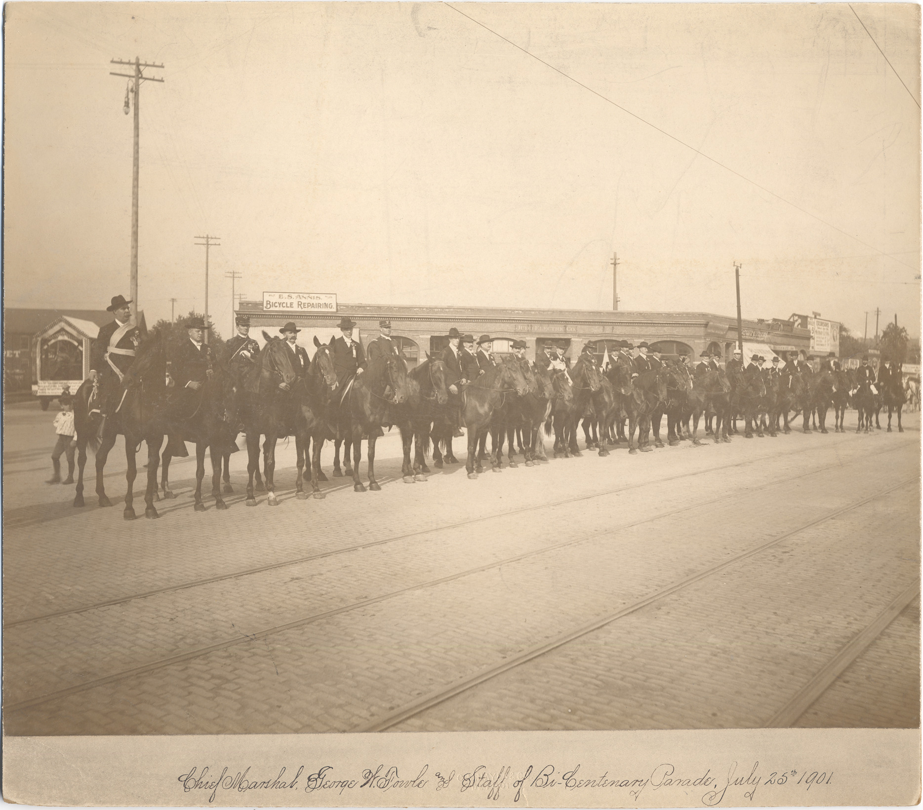 Favorite this☆ Bicentenary parade Description: Row of men on horseback; men wear hats and ribbons pinned to lapels. Sign in background: "E. S. Annis, bicycle repairing." Handwritten on front: "Chief Marshal, George W. Fowle and staff of Bi-centenary parade, July 25, 1901." Details Resource ID: DPA4729 Subject: Detroit (Mich.)--Centennial celebrations, etc. Parades--Michigan--Detroit Photographic prints Date Issued: 1901-07-25 Format: 1 photographic print mounted on mat board ; image 10 x 12.25 in. Member of: Burton Historical Collection Filing Location: D/Anniversaries-Bi-centenary celebration Rights: Physical rights are retained by DPL. Copyright is retained in accordance with U.S. copyright laws.