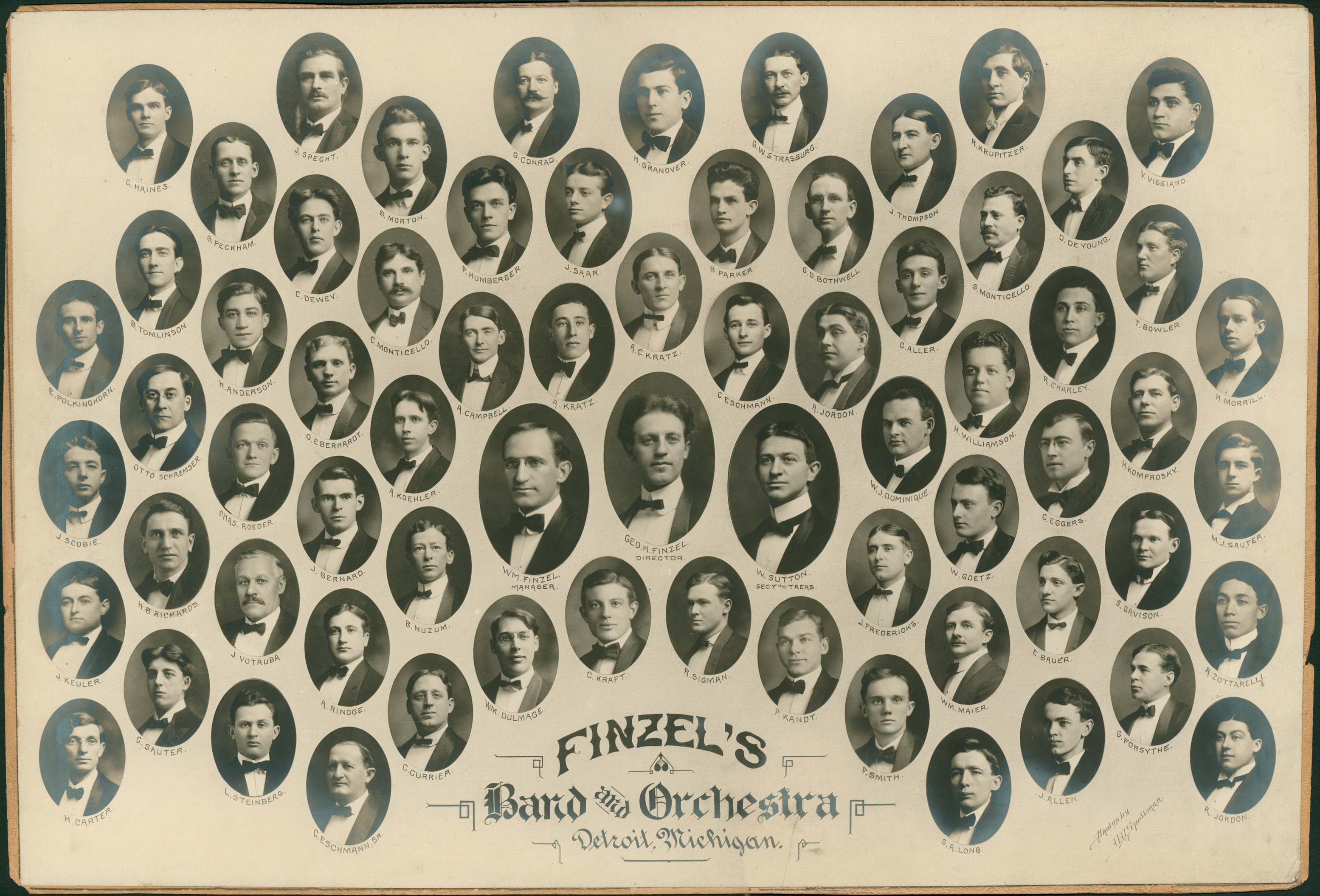Individual portraits of band members in evening dress; arranged in ovals on photograph. William Finzel led Detroit jazz dance band in the 1920s; called Finzel's Arcadia Orchestra of Detroit 1923-1925. Printed on photograph front (musicians listed in rows left to right): "Finzel's band and orchestra; Detroit, Michigan. C. Haines, J. Specht, G. Conrad, H. Grandover, G.W. Strasburg, R. Krupitzer, V. Viggiano; G. Peckham, C. Dewey, B. Morton, F. Humberger, J. Saar, B. Parker, G.D. Bothwell, J. Thompson, S. Monticello, D. DeYoung, T. Bowler; E. Polkinghorn, B. Tomlinson, H. Anderson, O. Eberhardt, C. Monticello, A. Campbell, A. Kratz, R.C. Kratz, C. Eschmann, A. Jordon, C. Aller, H. Williamson, R. Charley, T. Bowler, H. Morrill; J. Scobie, Otto Schremser, Chas. Roeder, J. Bernard, A. Koehler, Wm. Finzel, manager, Geo. H. Finzel, director, W. Sutton, sec'y. and treas., W.J. Dominique, W. Goetz, C. Eggers, H. Komfrosky, M.J. Sauter; J. Keuler, H.B. Richards, J. Vortruba, A. Rindge, B. Nuzum, Wm. Dulmage, C. Kraft, R. Sigman, F. Kandt, J. Fredericks, Wm. Maier, E. Bauer, G. Forsythe, A. Zottarelli; H. Carter, G. Sauter, L. Steinberg, C. Eschmann, Sr., C. Currier, F. Smith, S.A. Long, J. Allen, R. Jordon. Photos by D.D. Spellman." Typed on label on mat back: "Composite photograph of Finzel's band & orchestra. (Mrs. Alice Cowdin, 255 Tennyson, Highland Park, Michigan 48203)."