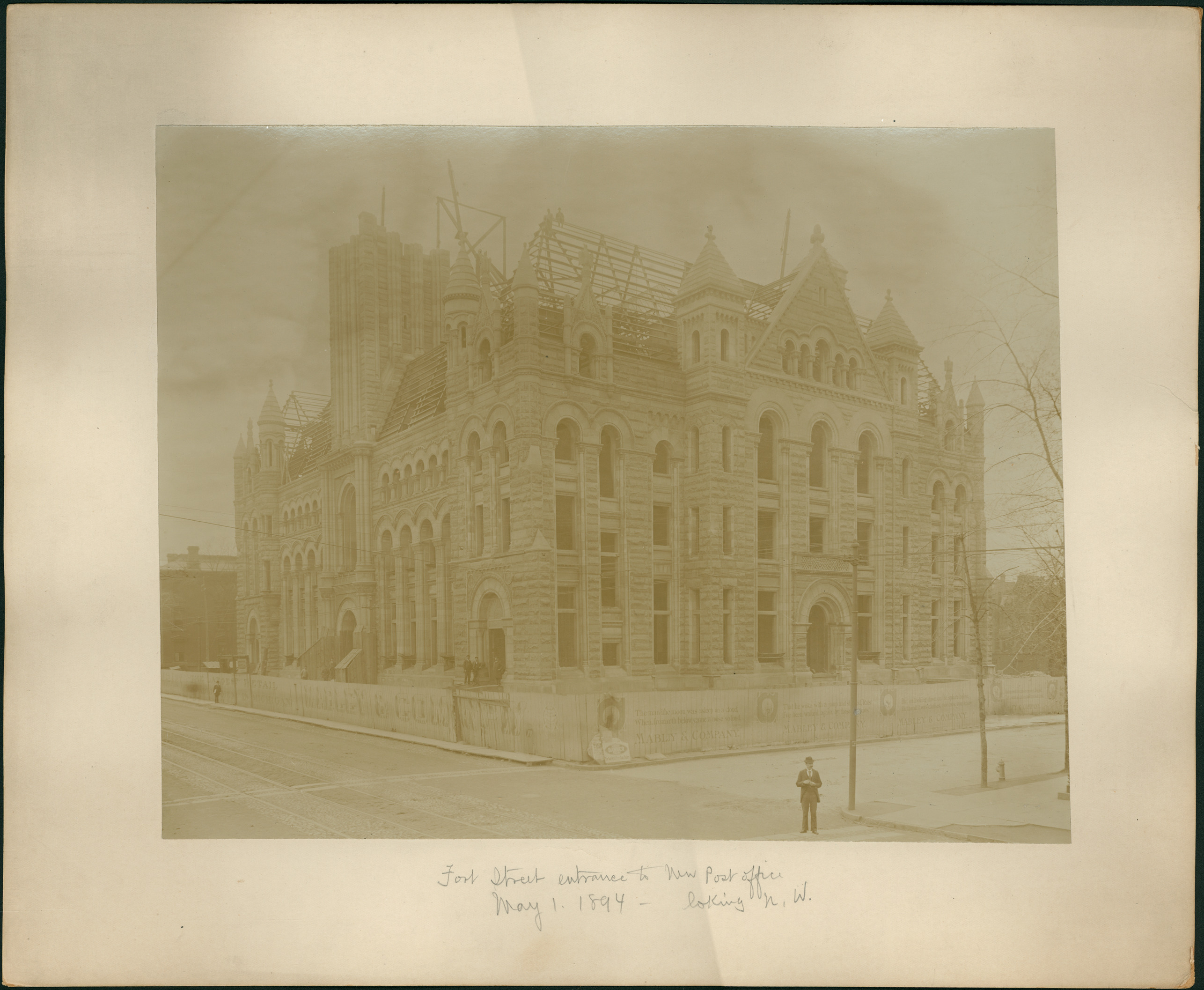 View of stone building in Richardsonian Romanesque style; roof still under construction with scaffolding; tall wooden fence surrounds building; workers stand in entrances and on scaffolding; man stands on corner across street. Handwritten on front: "Fort Street entrance to new post office, May 1, 1894, looking N.W." Stamped on back: "From Alvord & Co., exclusively commercial photographers, 55 Rowland St., Detroit, Mich., ground floor."
