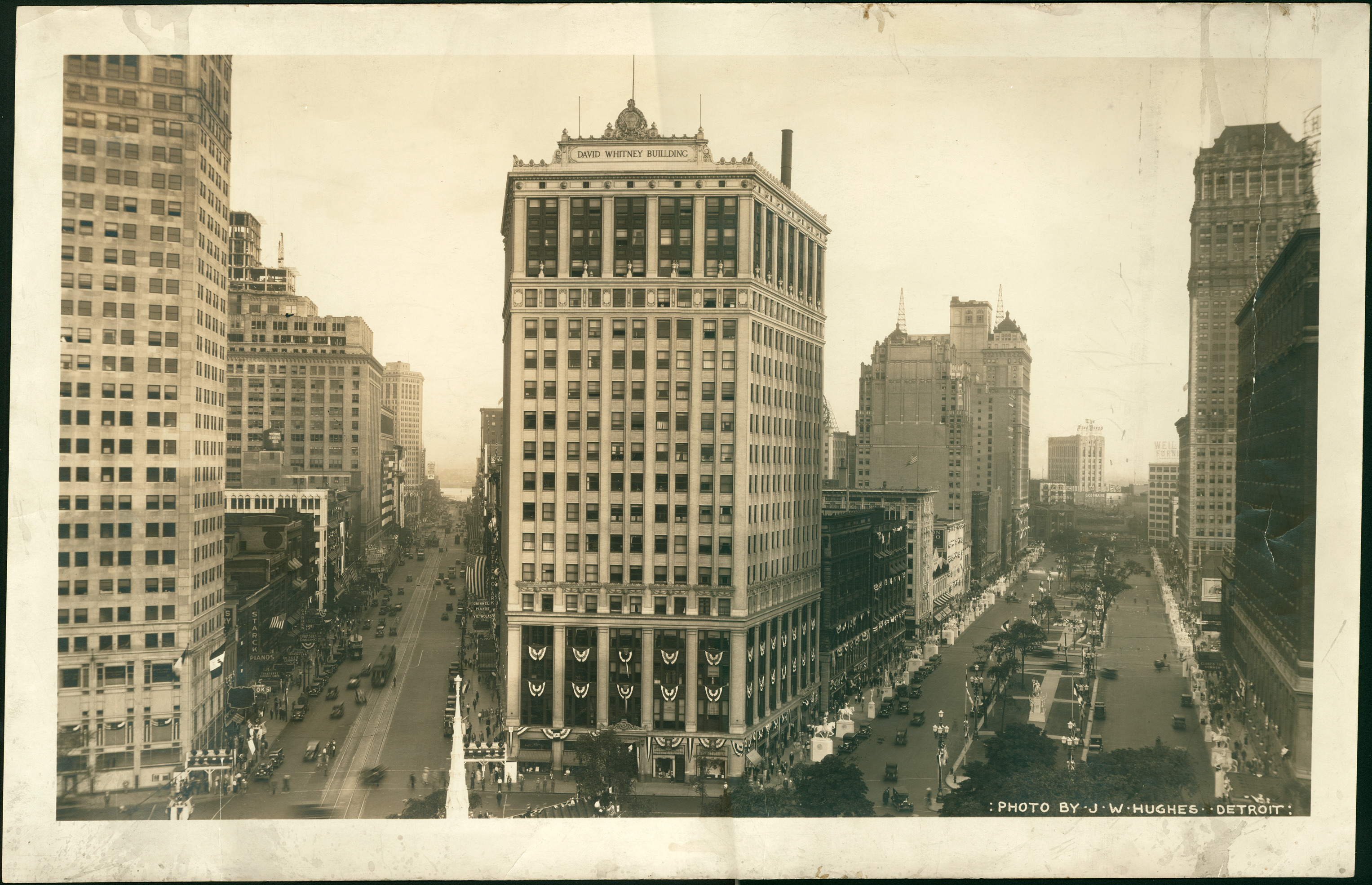 Favorite this☆ David Whitney building Description: View of David Whitney building with adjacent streets; multistory building draped with bunting on lower levels; equestrian statues line Washington Boulevard. Written on photograph: "Photo by J.W. Hughes, Detroit." Details Resource ID: DPA4754 Creator: Hughes, J.W. Subject: Office buildings--Michigan--Detroit Skyscrapers--Michigan--Detroit Photographers--Michigan--Detroit Photographic prints Date Issued: Unknown year Format: 1 photographic print ; 13 x 20 in. Member of: Burton Historical Collection Filing Location: LD/Buildings-David Whitney Rights: Physical rights are retained by DPL. Copyright is retained in accordance with U.S. copyright laws.