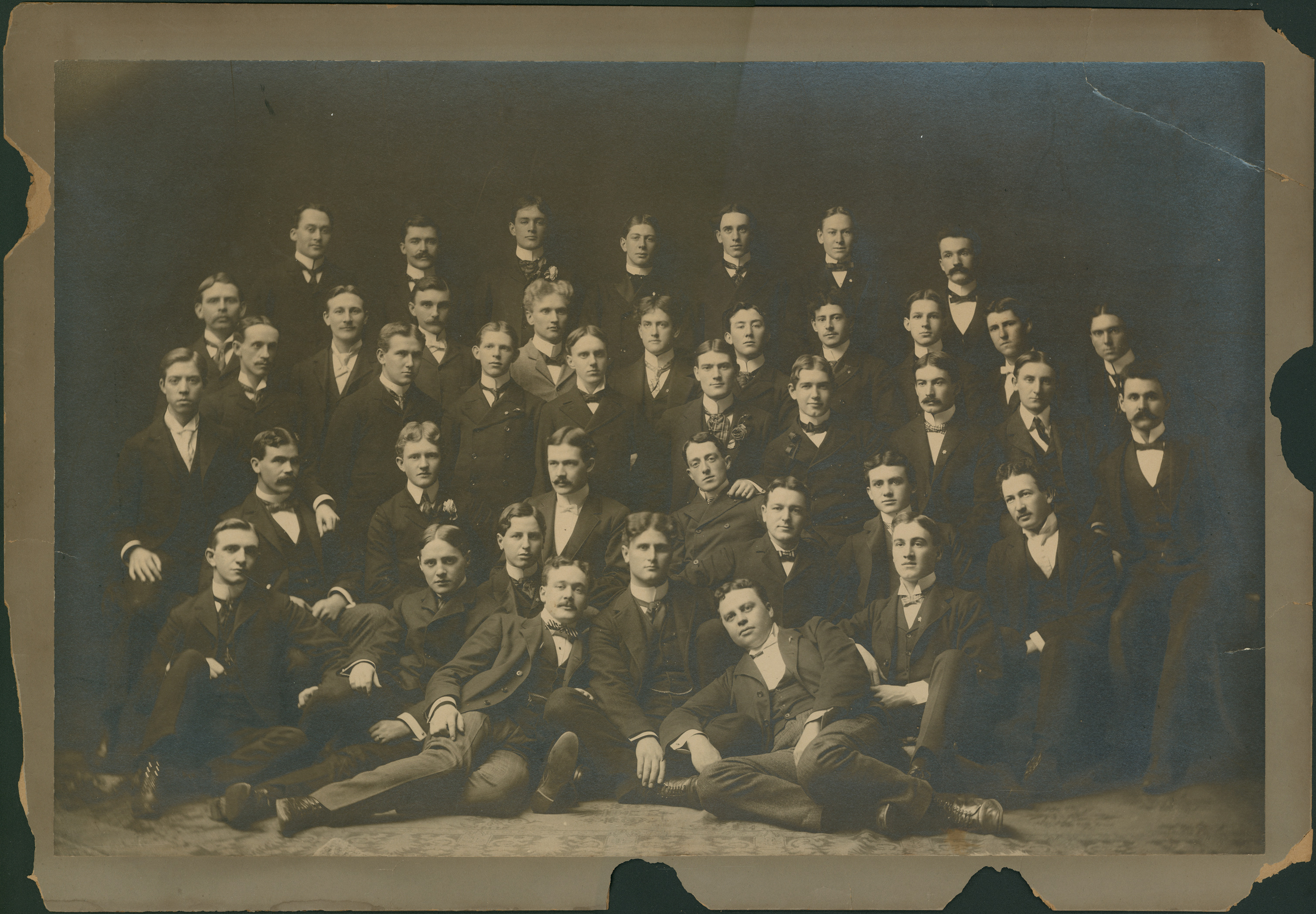 Group portrait of young men wearing suits. Handwritten on back: "U of D class, second row, 4th from left, William E. Keane." Stamped on back: "D.D. Spellman, photographer, 242 Woodward Ave., Detroit." Edges of mat damaged.