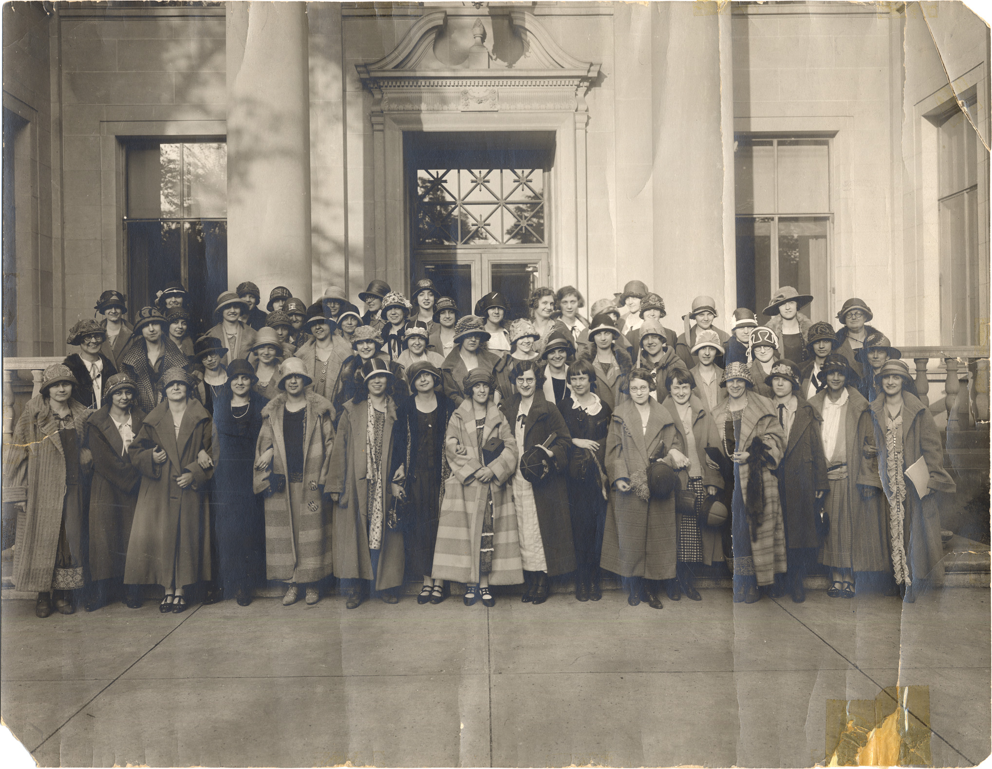 Group portrait of young women wearing hats and coats standing outside of building. Letter accompanying photograph: "This is a photograph of the graduation class of the Det. Trs. Col. June 1924. The setting is the headquarters of the Woman's Benefit Assoc. in Port Huron. The occasion was a week-end party held at the summer camp of the W.B.F. on Lake Huron during the week-end preceding Decoration Day at which time the club was opened for the season. The trip to Port Huron was made with much fanfare on a D.S.R. car that made a special trip to Grand River and the Blvd. to call for the group. Cars of the W.B.F. took the group from Pt. Huron to the camp. Return was made on the following Sunday from Pt. Huron to Det. on the steamer Tashmoo. Class advisors were Miss Julia ? and Miss Jessie Wedin. Faculty guests were Miss Eleanor Dye and Mrs. Martha Pritchard. Other faculty members motored to the camp for dinner with the group on Sunday. This is a very capable group of young women - stylish too!! Several have become important key teachers and administrators in the Det. School system."