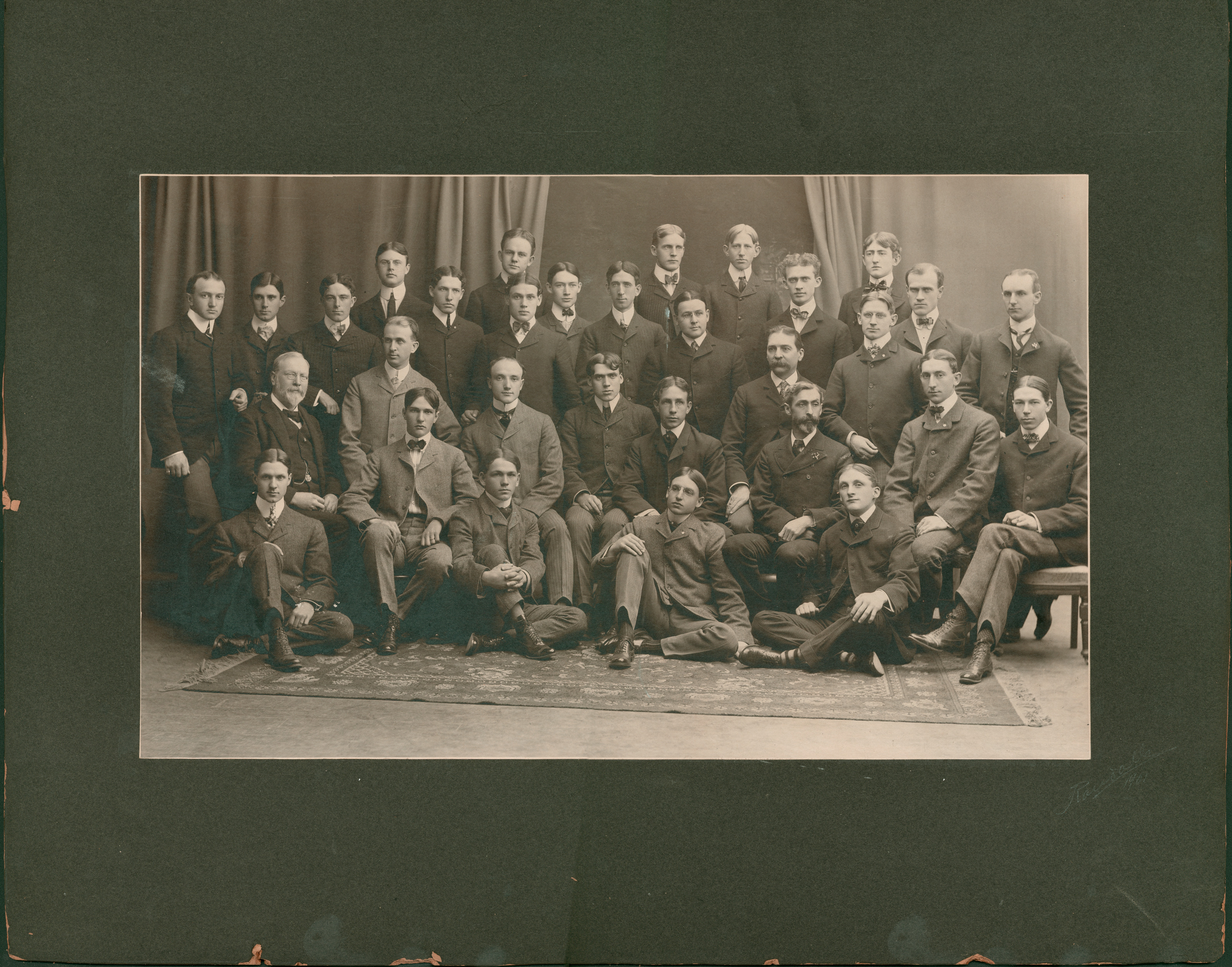 Group portrait of men wearing suits; drapery in background. Handwritten on front: "Randall's 1901."