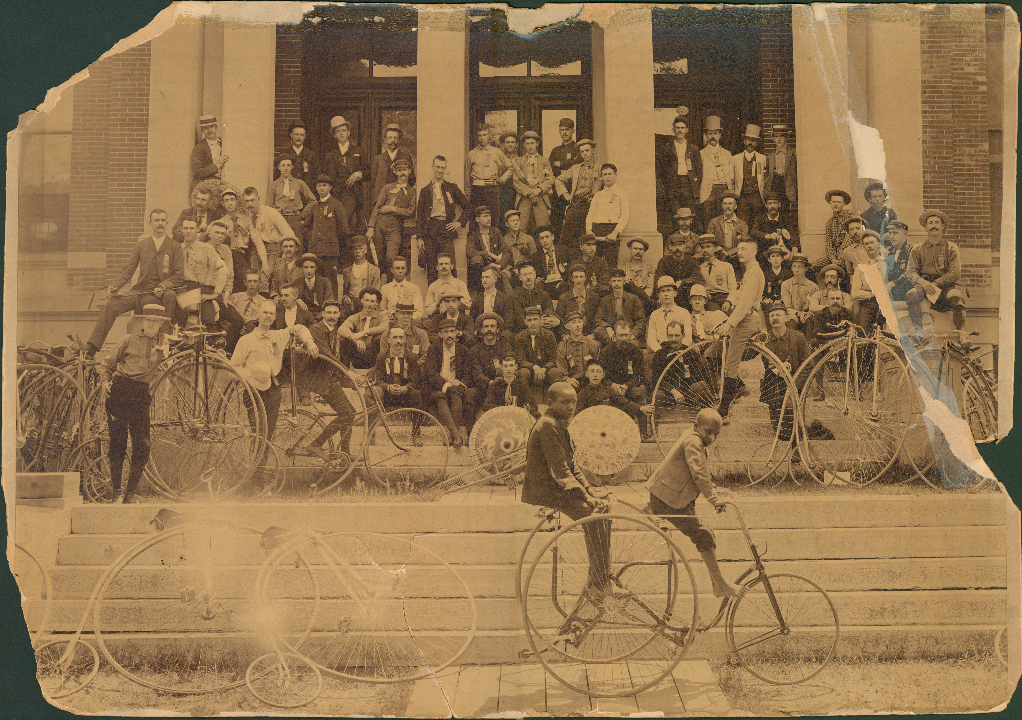 Large group of men and boys posed on steps to brick building . Dressed in a mix of sporting, casual, and business clothes; three wear top hats. Bicycles and tricycles on and in front of steps; two barefoot boys on tricycle. Several oriental paper parasols. Most bicycles have large front wheel, but at least one has wheels of equal size. Handwritten on photograph back: "A Detroit group of cyclists. Note 'Detroit' on hat of seated man in center. Building unknown. Frank Woodman, 812 Clairmount Ave, Detroit, Mich." Photograph and mat torn and flaking.