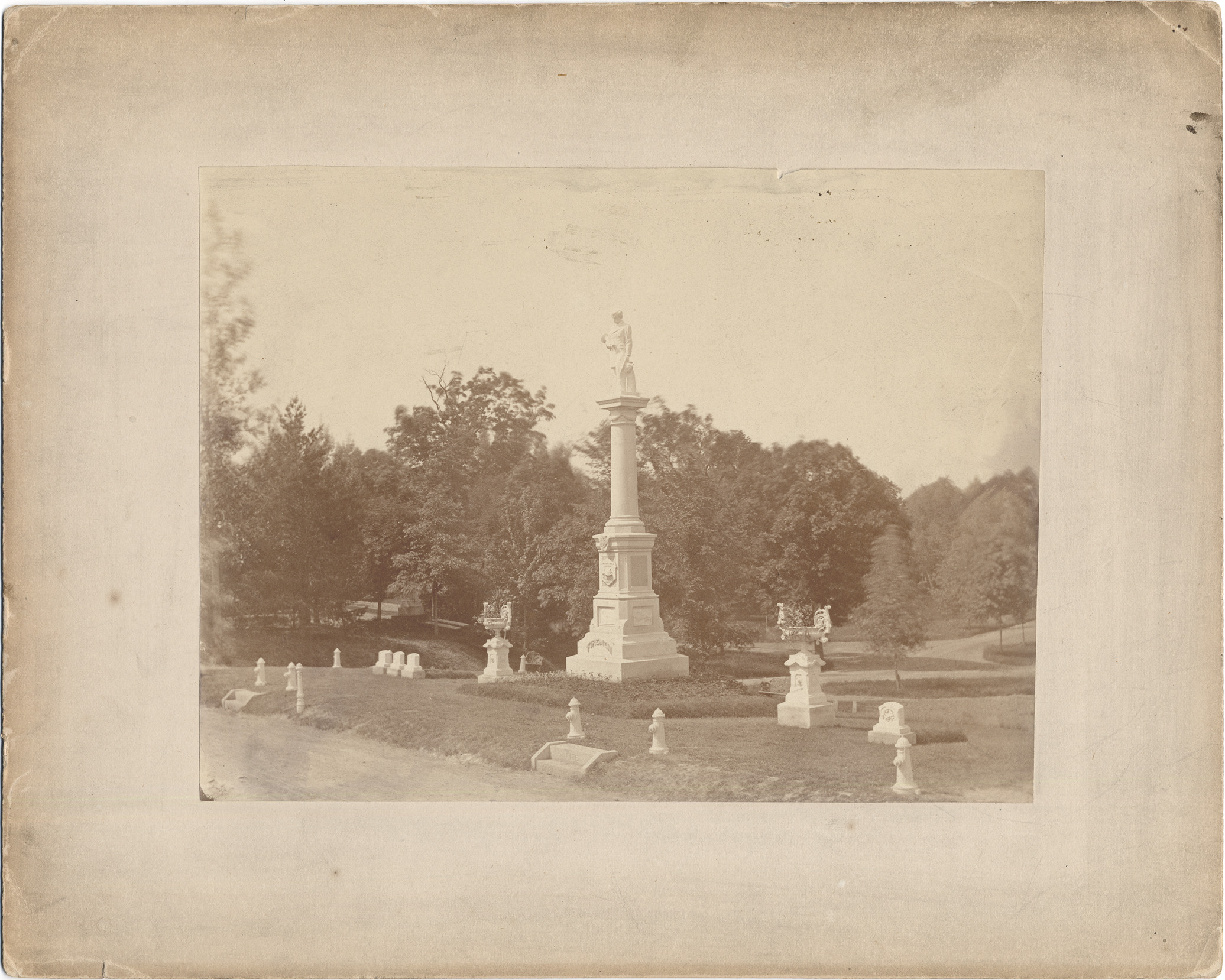 Favorite this☆ Fireman's Lot Monument in Elmwood Cemetery Description: View of monument with statue of man atop column; inscription of "Firemen" on base of monument; monument flanked by urns; stone replicas of fire hydrants in front. Handwritten on back: "Their monument in Elmwood Cemetery." Details Resource ID: DPA4785 Subject: Elmwood Cemetery (Detroit, Mich.) Fire fighters--Monuments--Michigan--Detroit Albumen prints Photographic prints Date Issued: Unknown year Format: 1 photographic print mounted on mat board ; image 7 x 9.5 in. Member of: Burton Historical Collection Filing Location: LD/Fire Department Rights: Physical rights are retained by DPL. Copyright is retained in accordance with U.S. copyright laws.