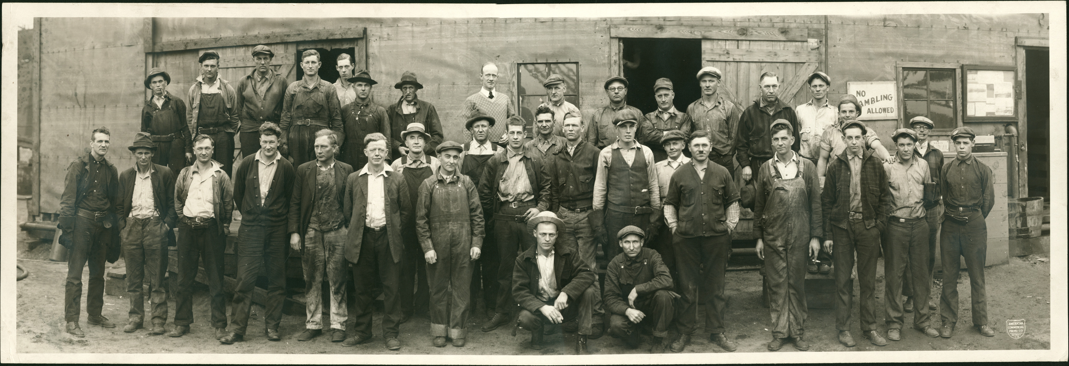 Favorite this☆ Workmen Description: Group of workmen pose outside wooden-frame building; sign at entrance: "No gambling allowed." Printed on front: "American Commercial Photo Co., Detroit, 1928." Details Resource ID: DPA4864 Creator: American Commercial Photo Co. Subject: Blue collar workers--Michigan--Detroit Photographers--Michigan--Detroit Photographic prints Date Issued: 1928 Format: 1 photographic print ; 8 x 23.5 in. Member of: Burton Historical Collection Filing Location: LD/Industries and business houses Rights: Physical rights are retained by DPL. Copyright is retained in accordance with U.S. copyright laws.