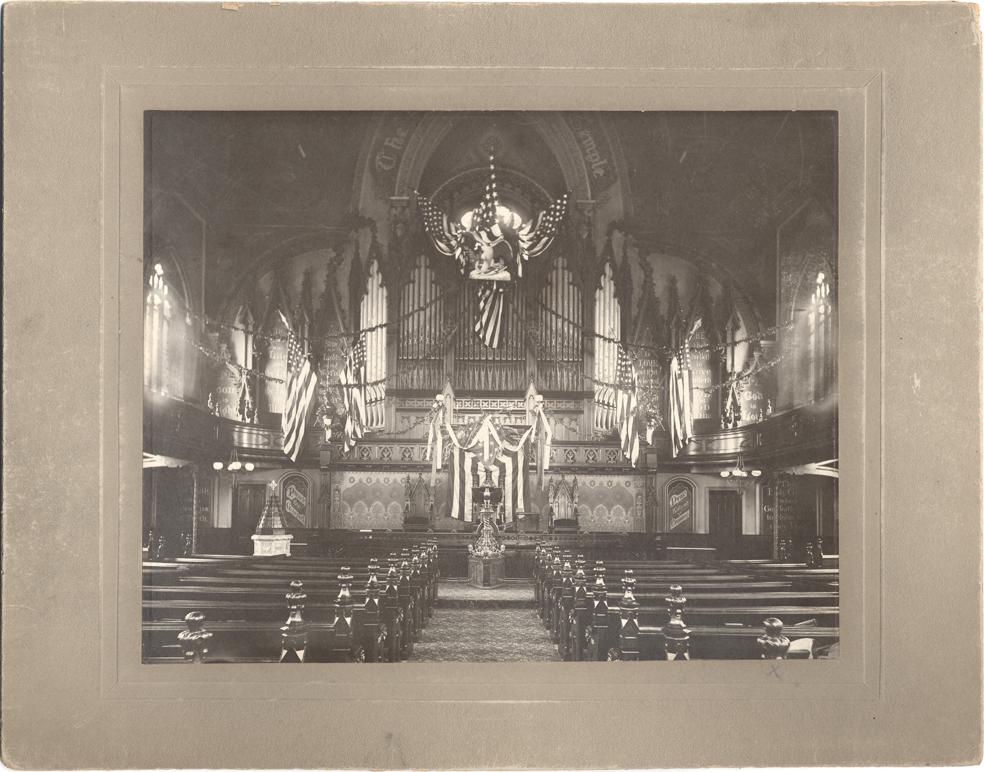 View of church interior; altar and balcony decorated with garlands, bunting and American flags; large decoration with eagle and American flags over pipe organ. Handwritten on back: "Fort Street Presbyterian Church in Detroit, decorated for Memorial Day ? or for some other special occasion. Photograph taken many years ago. The interior now (in 1941) is somewhat different having been done over after a fire." Stamped on back: "L. W. Penny, photographer, Detroit, Mich."