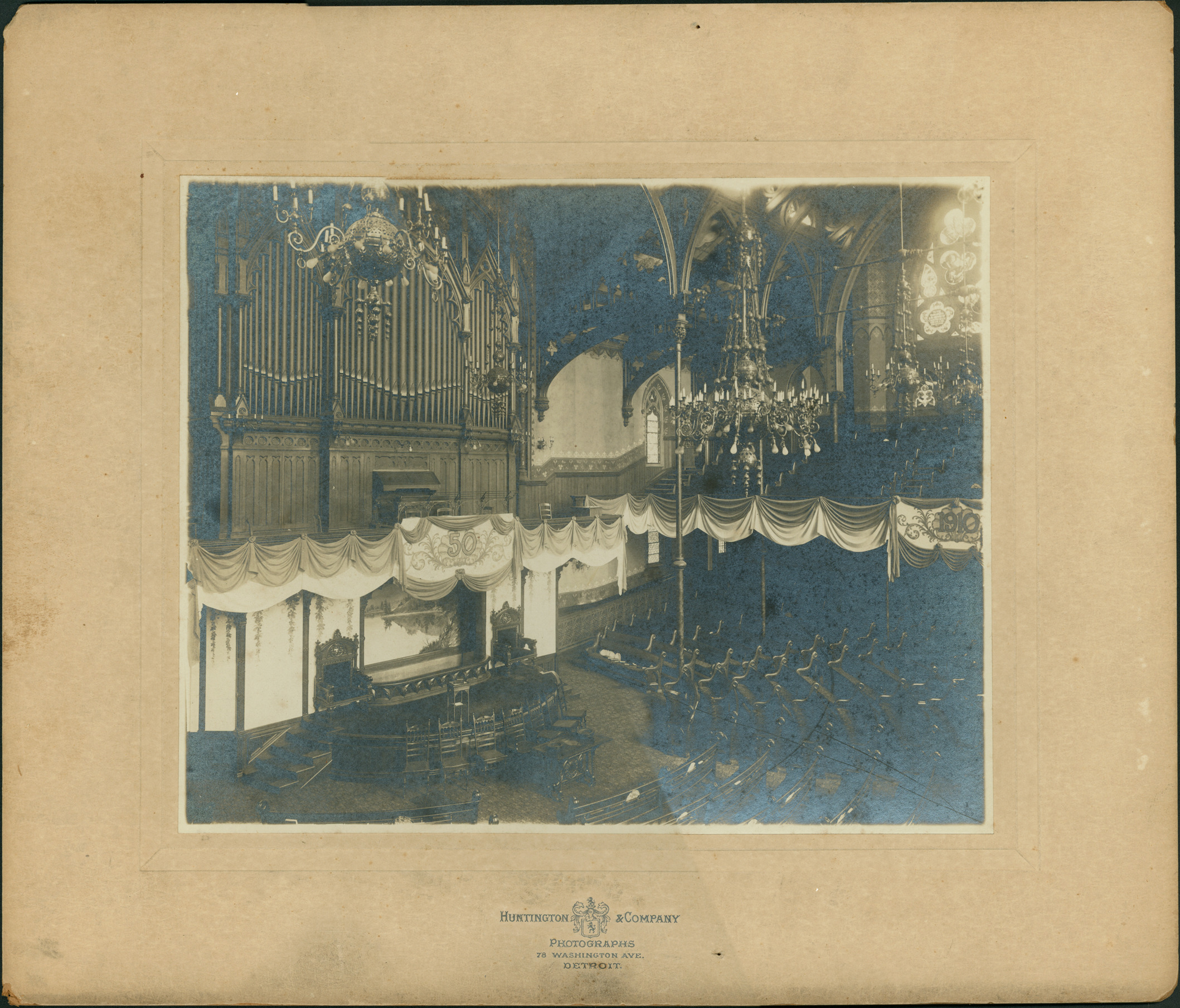 Interior of the Woodward Ave. Baptist Church; pipe organ; balconies draped with bunting and signs reading: "50; 1910." Ornate chandeliers; pews in semicircular arrangement. Printed on front: "Huntington & Company, photographs, 78 Washington Ave., Detroit."