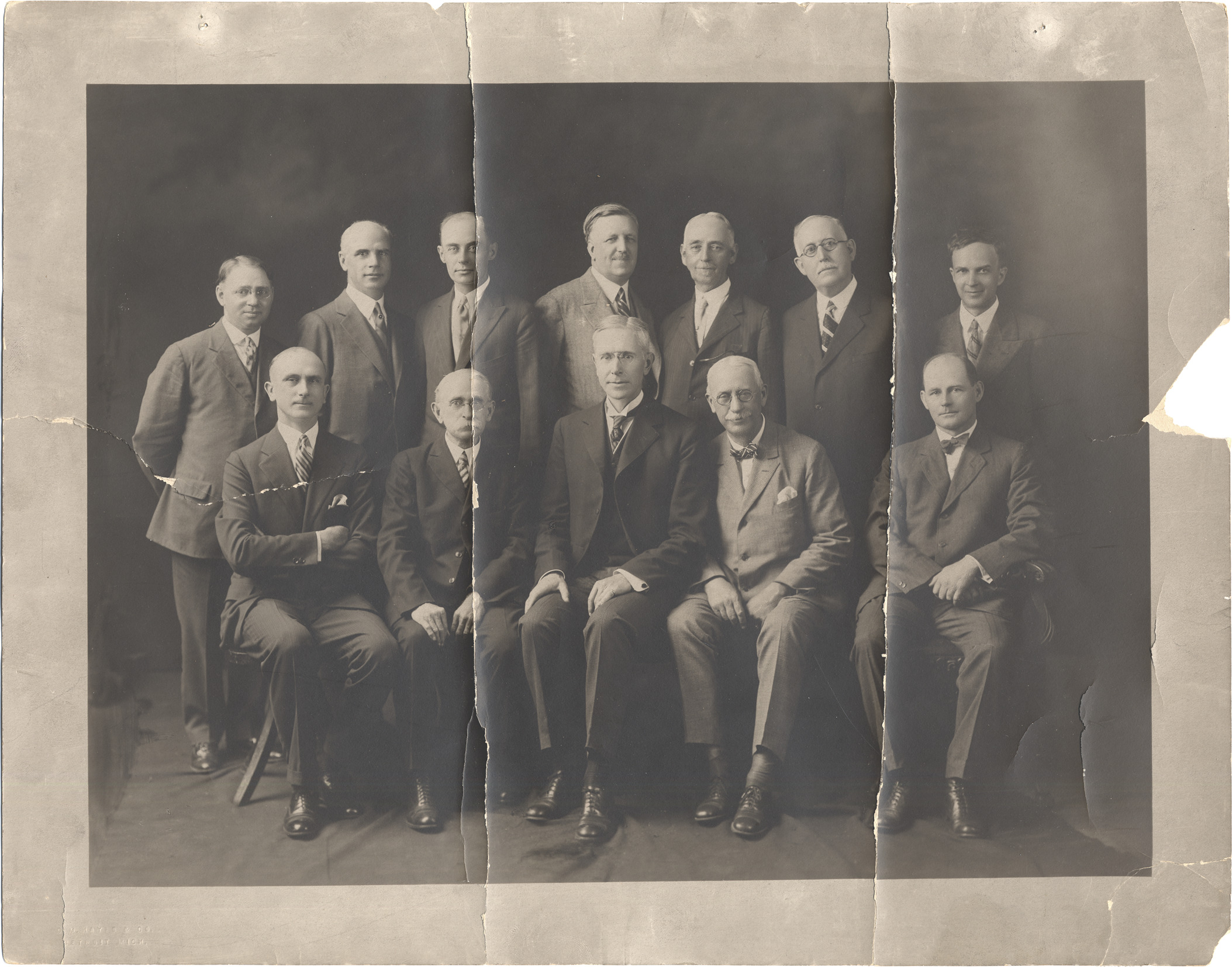 Group portrait of Dr. Minot Morgan and elders of the Fort Street Presbyterian Church. Top row includes Elders Amos E. Winegarden, Robert C. Laing, Clarence W. Videan, Dr. William J. Stapleton, Dr. Edwin S. Sherrill, John P. McKerrow and A.S. Watson. Front row includes John W. Holzhauser, Theodore L. Wiggins, Dr. Minot Morgan, George H. Foote and Walter Scotten. Dr. Minot C. Morgan was pastor from 1917-1927. Handwritten on back: "Elders and Dr. Morgan, sometime in 1920's."
