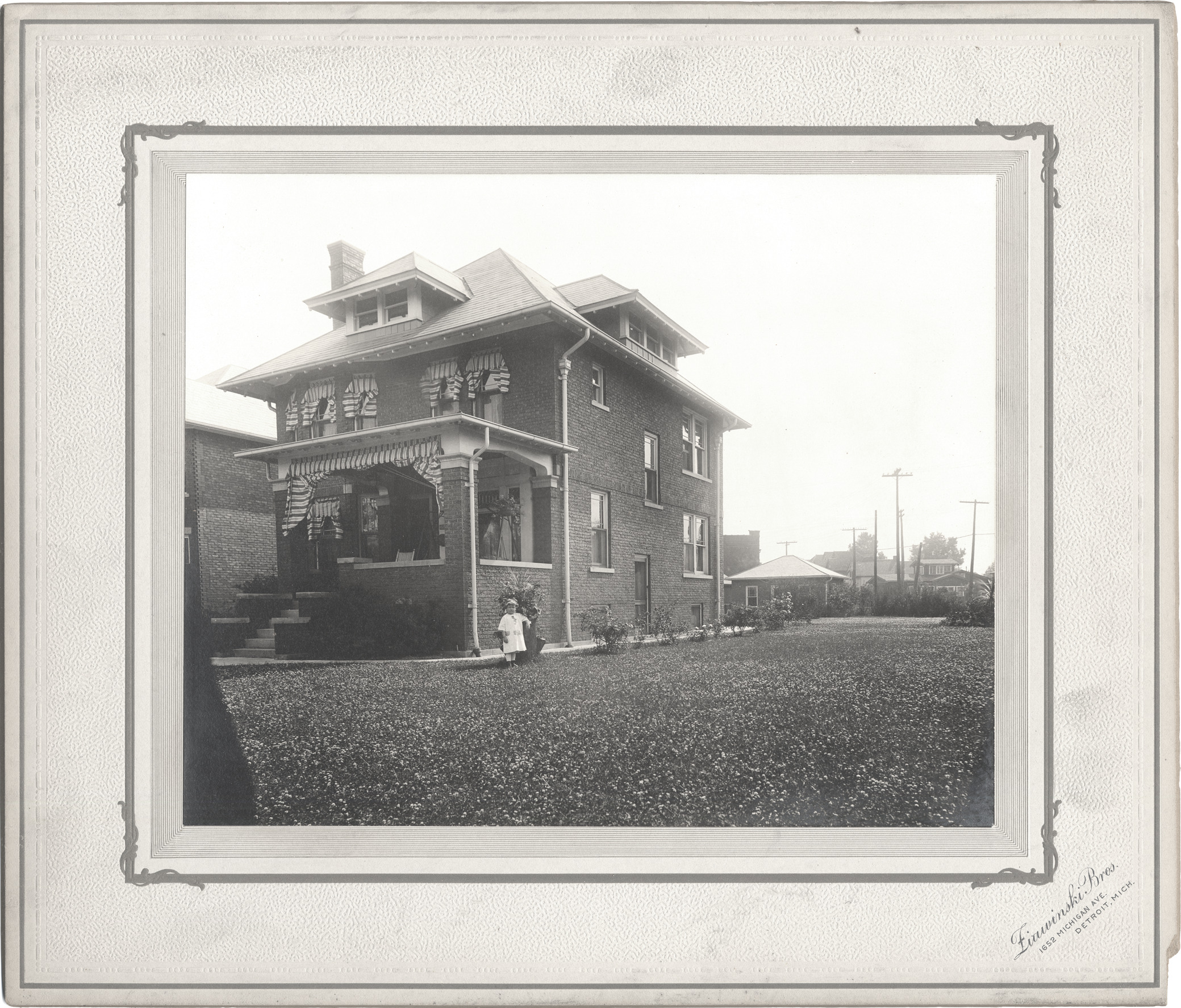 View of brick house with covered porch and side yard; striped awnings on windows; a child stands next to the house. Stamped on front: "Liawinski Bros., 1652 Michigan Ave., Detroit, Mich." Handwritten on back: "Picture of the original home of Judge Christopher Stein at 1710 W. Grand Blvd., Detroit, Mi., circa (1900-1948)."