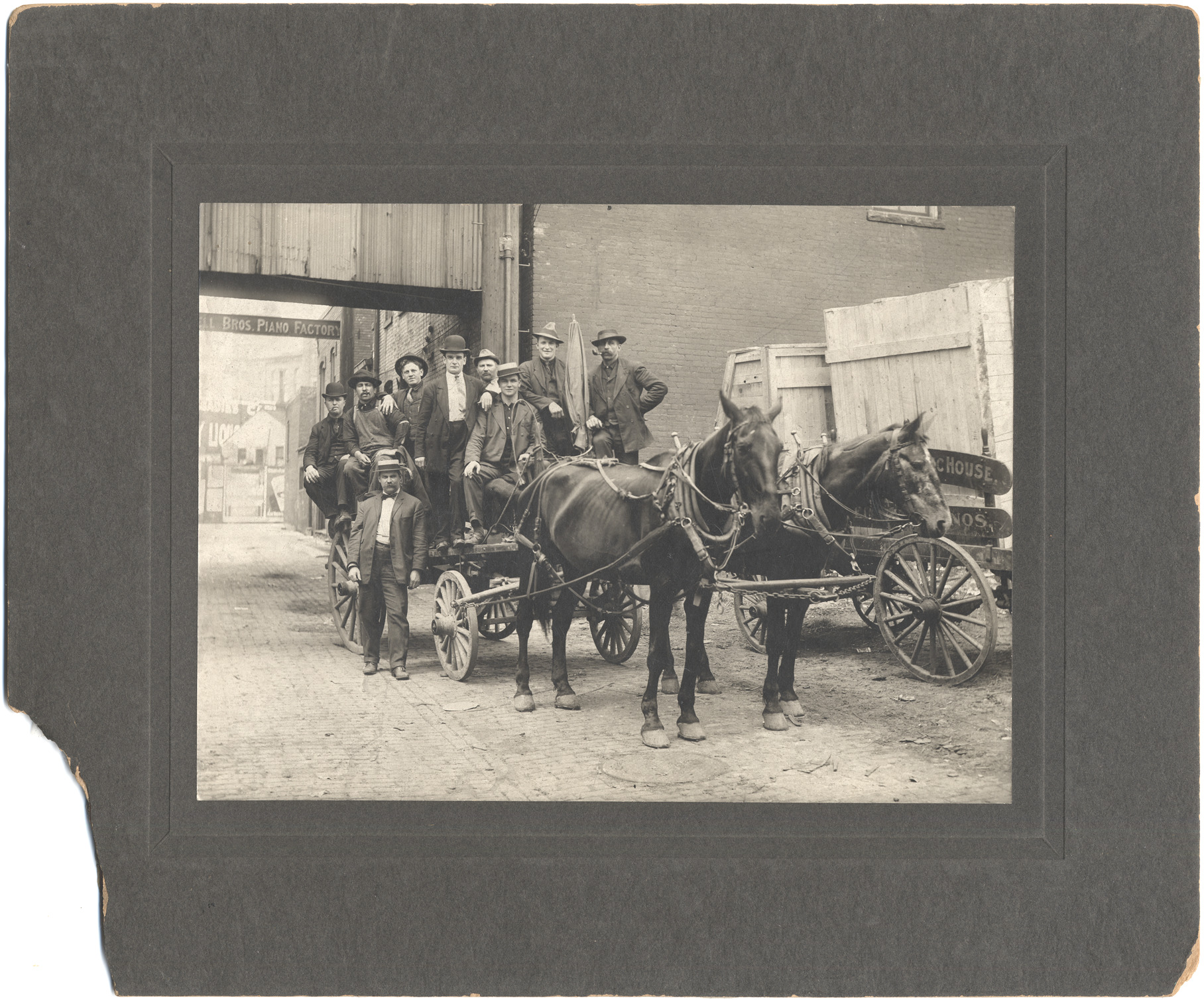 Favorite this☆ Employees of Grinnell Brothers Description: Men pose on horse-drawn wagon in front of another wagon holding large crates. Sign behind wagon: "[Grinn]ell Bros. piano factory." Details Resource ID: DPA4889 Subject: Music stores--Michigan--Detroit Music stores--Employees Horse-drawn vehicles--Michigan--Detroit Photographic prints Date Issued: Unknown year Format: 1 photographic print mounted on mat board ; image 6 x 8.25 in. Member of: Burton Historical Collection Filing Location: LD/Industries & business houses-Grinnell Bros. Rights: Physical rights are retained by DPL. Copyright is retained in accordance with U.S. copyright laws.