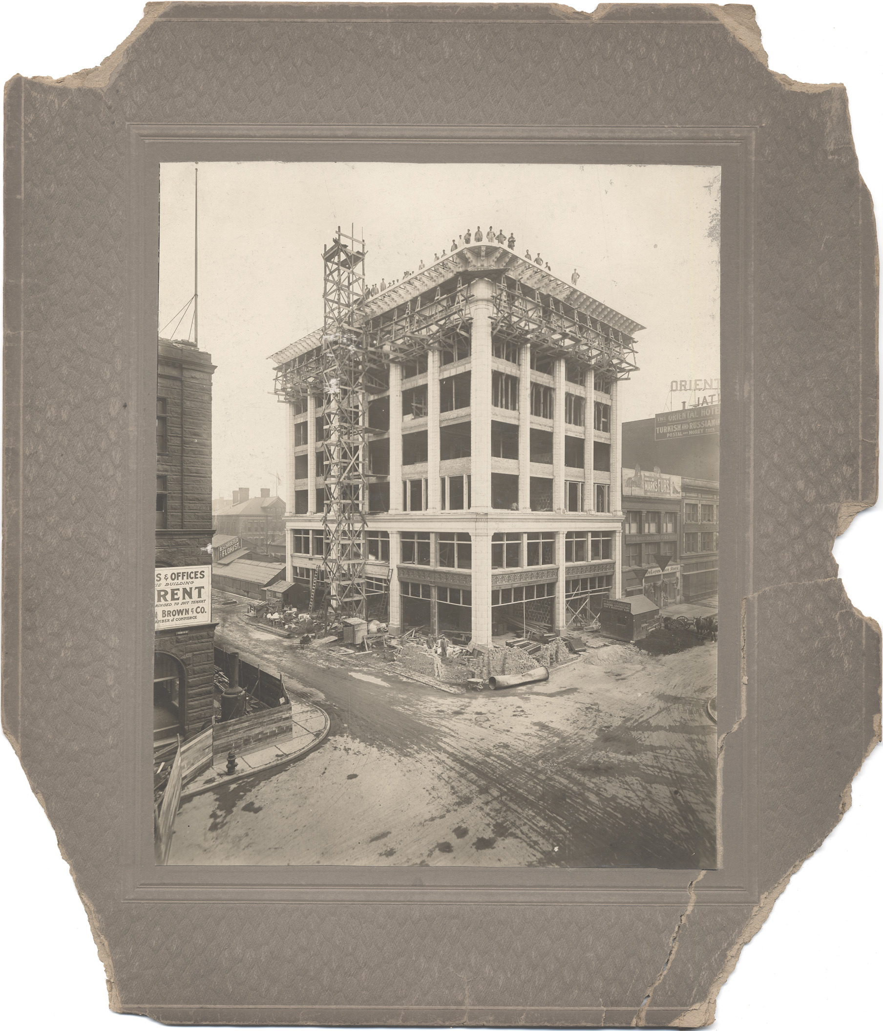 View of commercial building under construction; scaffolding next to building; construction debris on street; workers stand on roof.