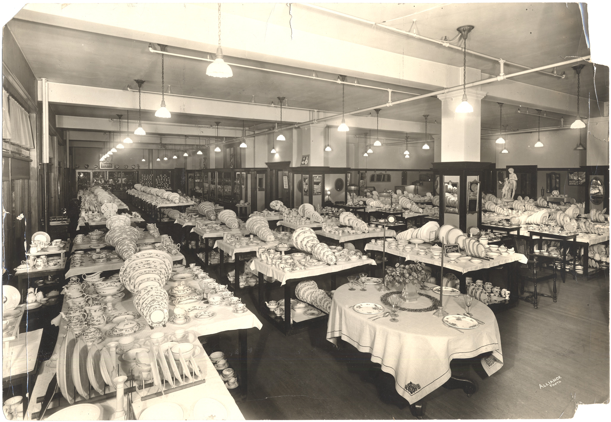 View of store showroom with rows of tables displaying place settings of china; dining room table with dinnerware, floral arrangement and candlesticks; glass display cases along sides of room. Printed on photograph: "Alliance Photo." Stamped on back: "Alliance Commercial Photo Co., 708 Delaware Ave., Market 2831, Detroit."