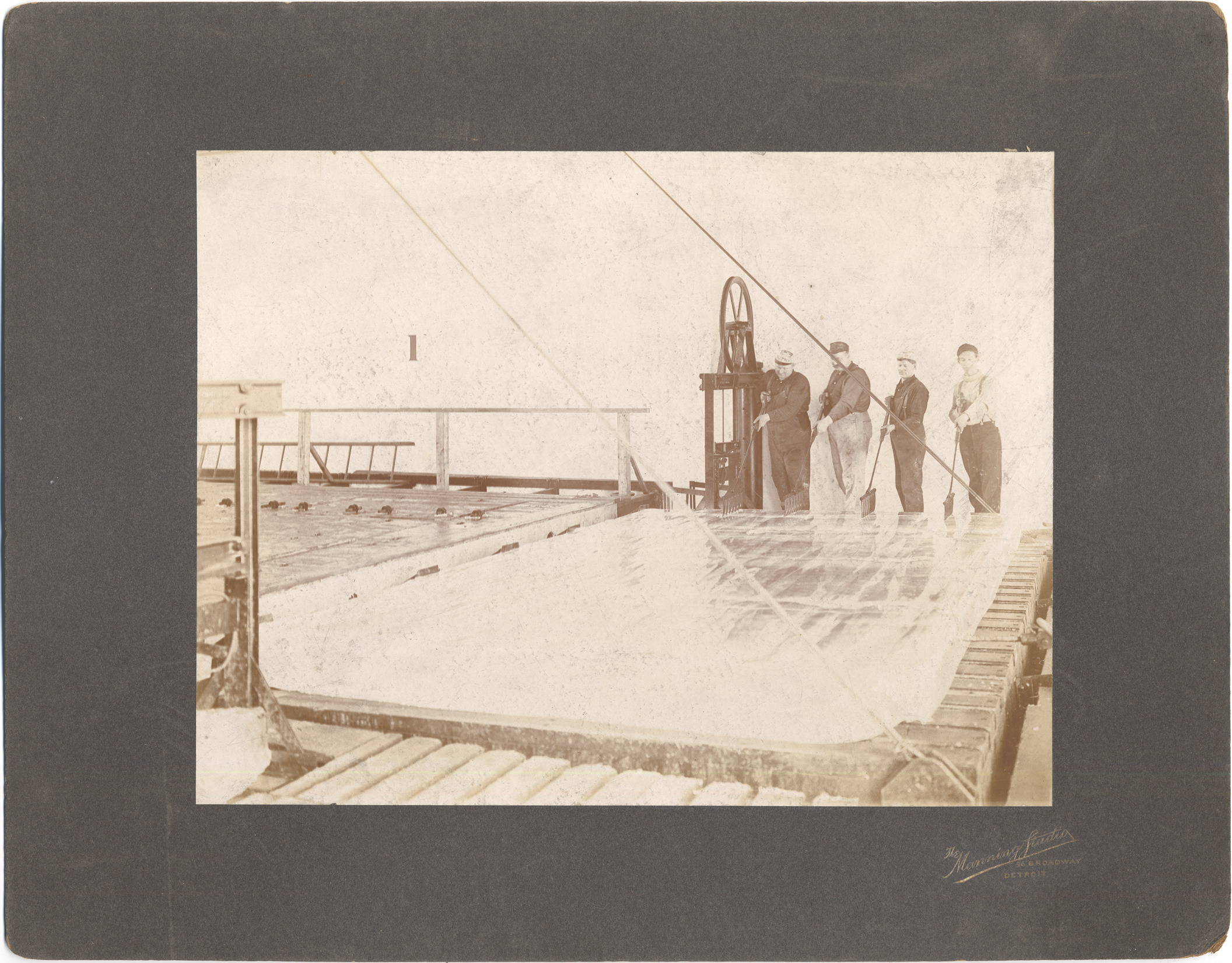 Favorite this☆ Murphy Ice Plant Description: View of four men standing over large block of ice with rakes; ice block sits on top of pallet; machinery with wheel and pulley. Stamped on front: "The Manning Studio, 96 Broadway, Detroit." Details Resource ID: DPA4908 Creator: Manning Studio Subject: Ice industry--Michigan--Detroit Photographers--Michigan--Detroit Photographic prints Date Issued: Unknown year Format: 1 photographic print mounted on mat board ; image 7.5 x 9.75 in. Member of: Burton Historical Collection Filing Location: LD/Industries & business houses-Murphy Ice Plant Rights: Physical rights are retained by DPL. Copyright is retained in accordance with U.S. copyright laws.