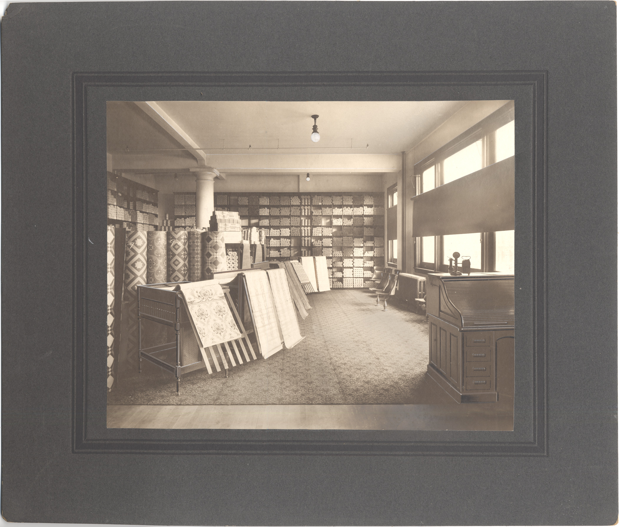 Favorite this☆ Pardridge & Blackwell Description: View of wallpaper department in store; rolls on wallpaper stacked on shelves and lined up on floor; sample books; rolltop desk with telephone in foreground; boxes labeled "Paper hangers." Details Resource ID: DPA4935 Subject: Department stores--Michigan--Detroit Wallpaper--Michigan--Detroit Photographic prints Date Issued: Unknown year Format: 1 photographic print mounted on mat board ; image 7.5 x 9.5 in. Member of: Burton Historical Collection Filing Location: LD/Industries & business houses-Pardridge & Blackwell Rights: Physical rights are retained by DPL. Copyright is retained in accordance with U.S. copyright laws.