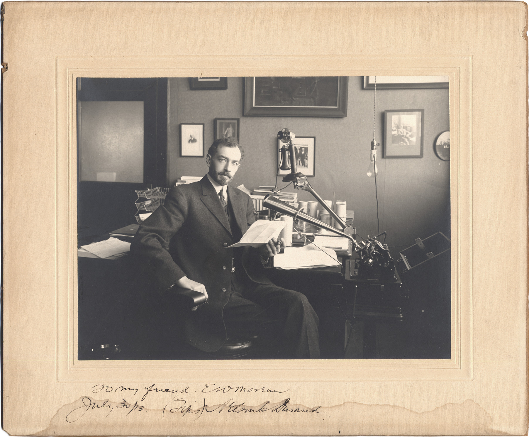 Man poses at desk in front of a dictating machine, holding a piece of paper. Machine has cylindrical metal tube and a telephone; light bulb hangs over machine; spools of paper on desk. Handwritten on front: "To my friend EW Moreau, July 30/13. Nelson ? Durand." Handwritten on back: "E.W. Moreau, 419 Free Press build." Listed in 1915 City Directory as Roach-Reid Co., E W Moreau, manager, dictating machines, 419 Free Press building. Water stains on mat.