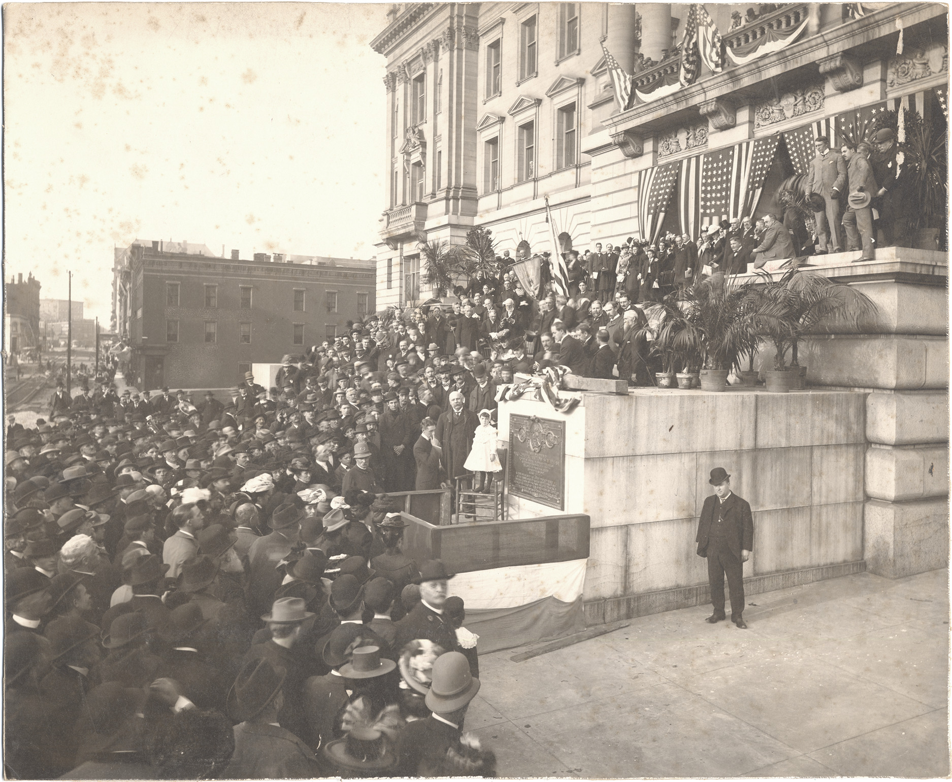 Dignitaries and other spectators gather on steps of building decorated with ferns, bunting and American flags to celebrate unveiling of tablet or plaque dedicated to General Anthony Wayne. Small stage has been constructed in front of tablet; a girl in a white dress stands on a chair next to the tablet. Handwritten on back: "Unveiling of Wayne tablet, Oct. 19, 1901."