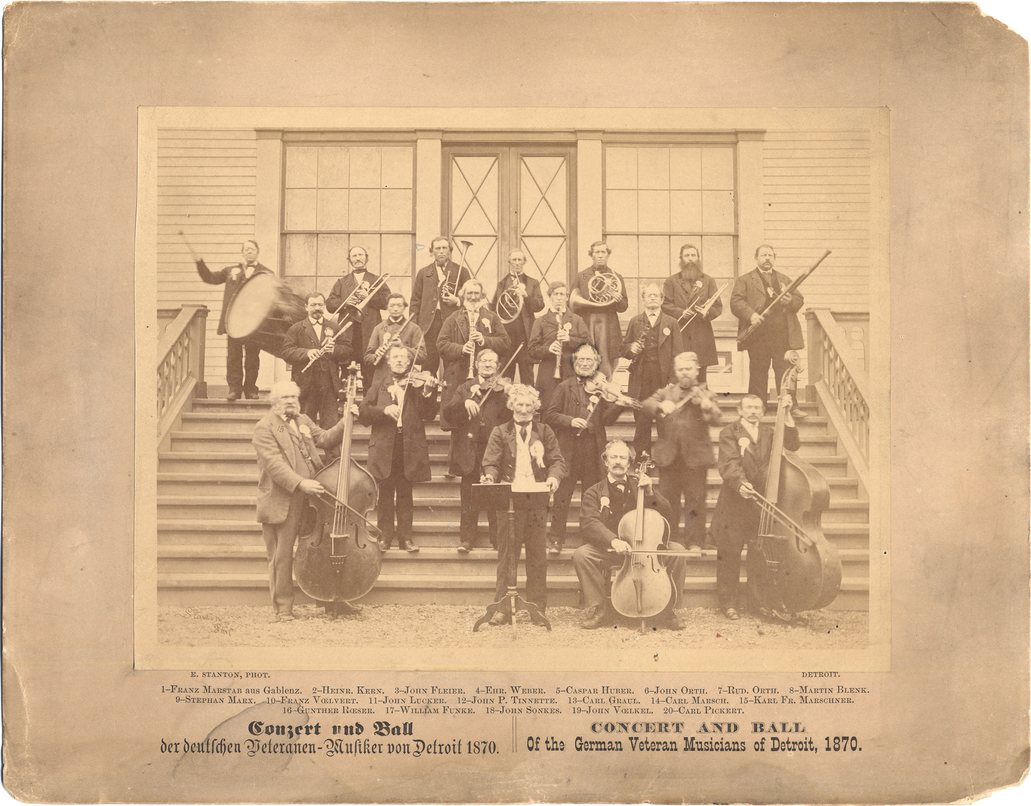 Group of musicians pose on steps of building holding their musical instruments; conductor with podium in first row. Printed on photograph: "Stanton, phot." Printed on front: "E. Stanton, phot., Detroit; 1. Franz Marstab aus Gablenz. 2. Heinr. Kern, 3. John Fleier, 4. Ehr. Weber, 5. Caspar Huber, 6. John Orth, 7. Rud. Orth, 8. Martin Blenk, 9. Stephan Marx, 10. Franz Voelvert, 11. John Lucker, 12. John P. Tinnette, 13. Carl Graul, 14. Carl Marsch, 15. Karl Fr. Marschner, 16. Gunther Roeser, 17. William Funke, 18. John Sonkes, 19. John Voelkel, 20. Carl Pickert; Conzert und Ball, der deutschen Veteranen-Musiker von Detroit 1870; concert and ball of the German Veteran Musicians of Detroit, 1870."