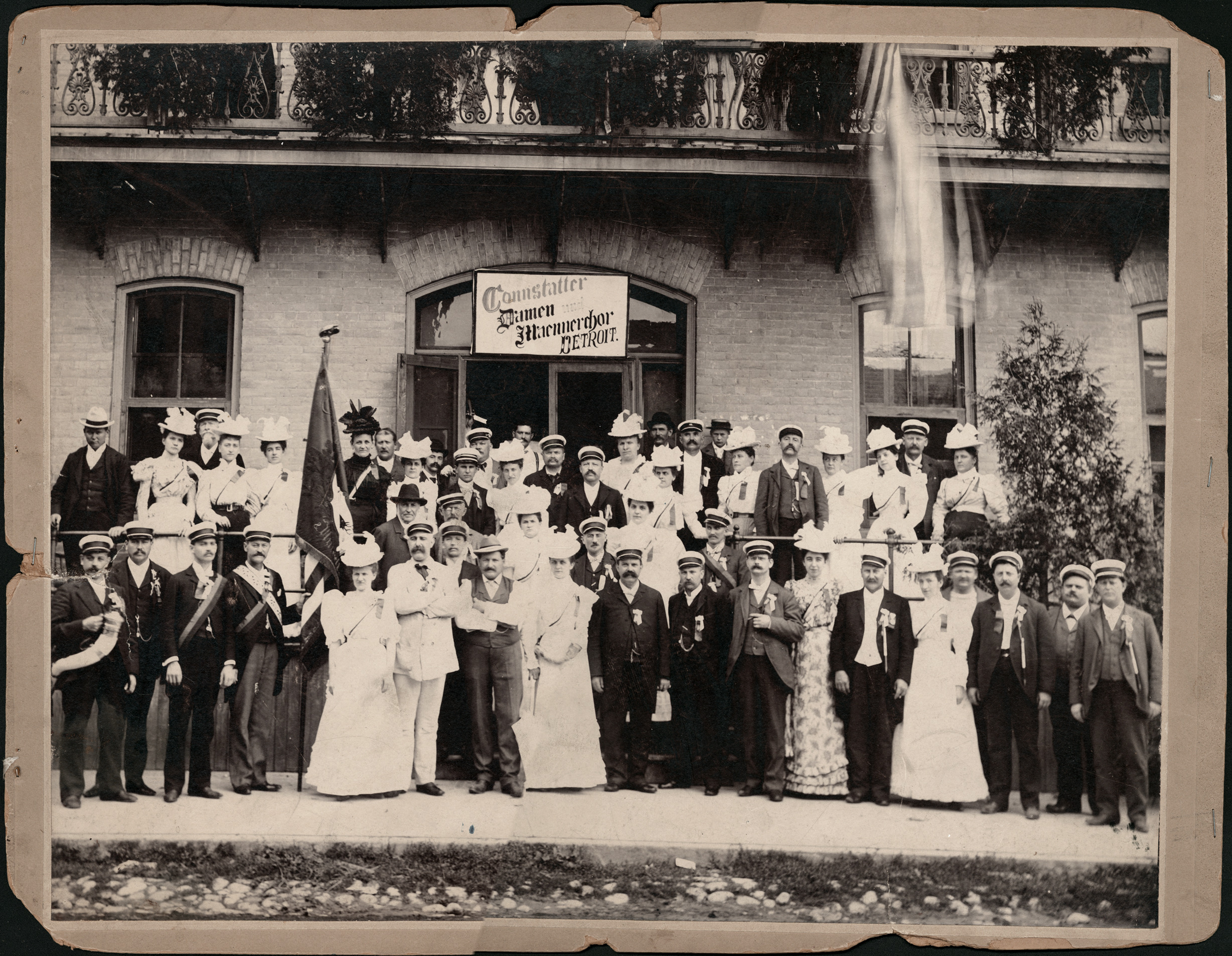 Group of men and women pose outside of brick building; men wear ribbons pinned to their lapels; women wear sashes; sign on building: "Connstatter Damen und Maennerchor, Detroit." Handwritten on back: "Connstatter Mens and Ladies Chorus of Detroit, Mich., convention at Berline and Waterloo, Canada, about 1895. Some of members names: Hermann Becker, brewer, Tony Muer, cigar mfr, father of former Detroit mayor, Fred Flachman, jeweler, Mr. Ludwig, wagon maker, Captain Rhody of the old Scot guards, A. M. Phahler, Mr. Stortz, Mr. Fleisher, daughters of Betz the baker on Gratiot Av. near Orleans."