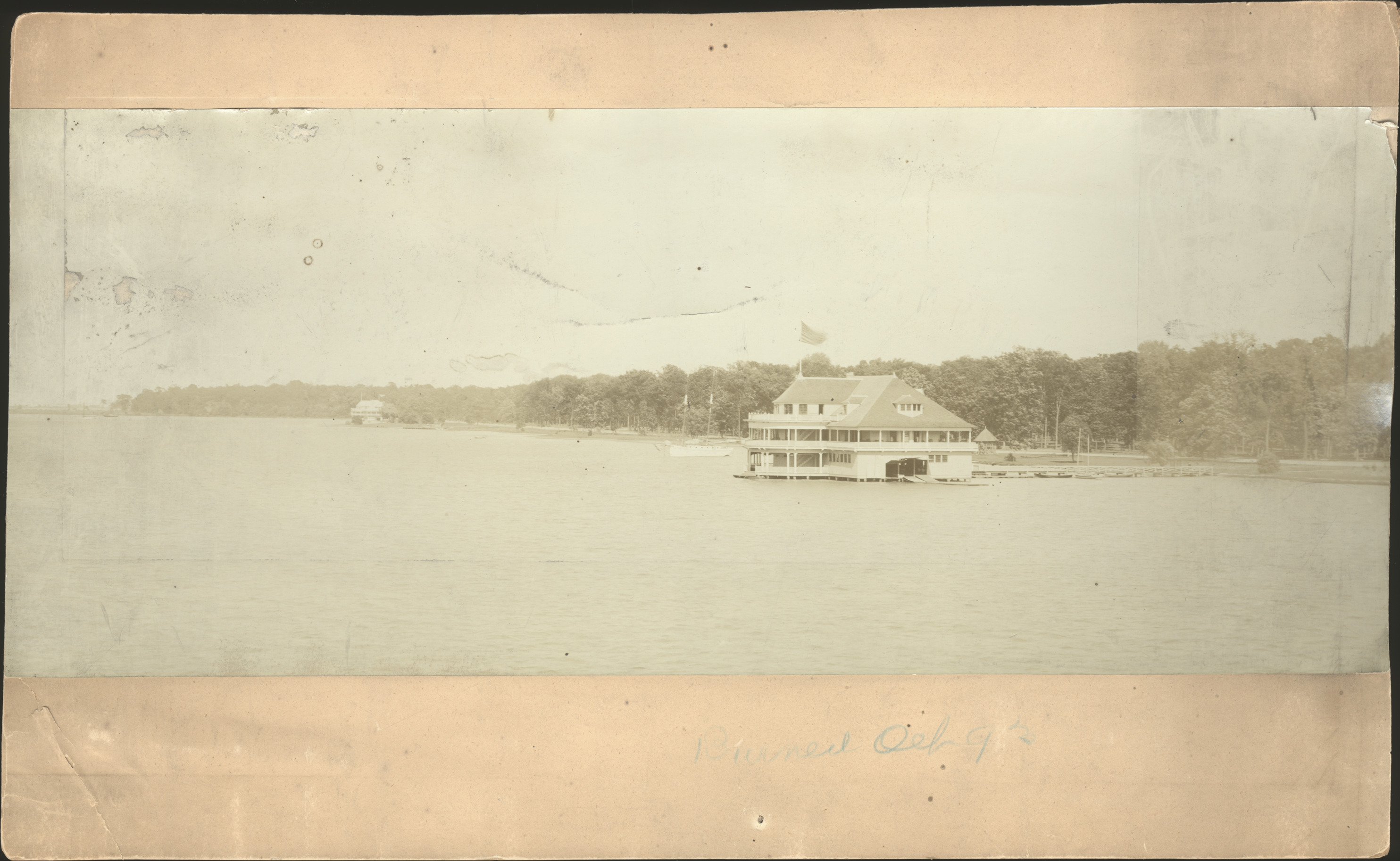 View of Detroit Boat Club; wooden-frame building with verandas and dormer windows; dock leads from shore to boathouse; shore of Belle Isle in background. Handwritten on front: "Burned Oct 92 [93]." Label on back: "W.H. Gardiner, photographer, 157 Park Street, special: general viewing, convention groups and flash light, Detroit, Mich."