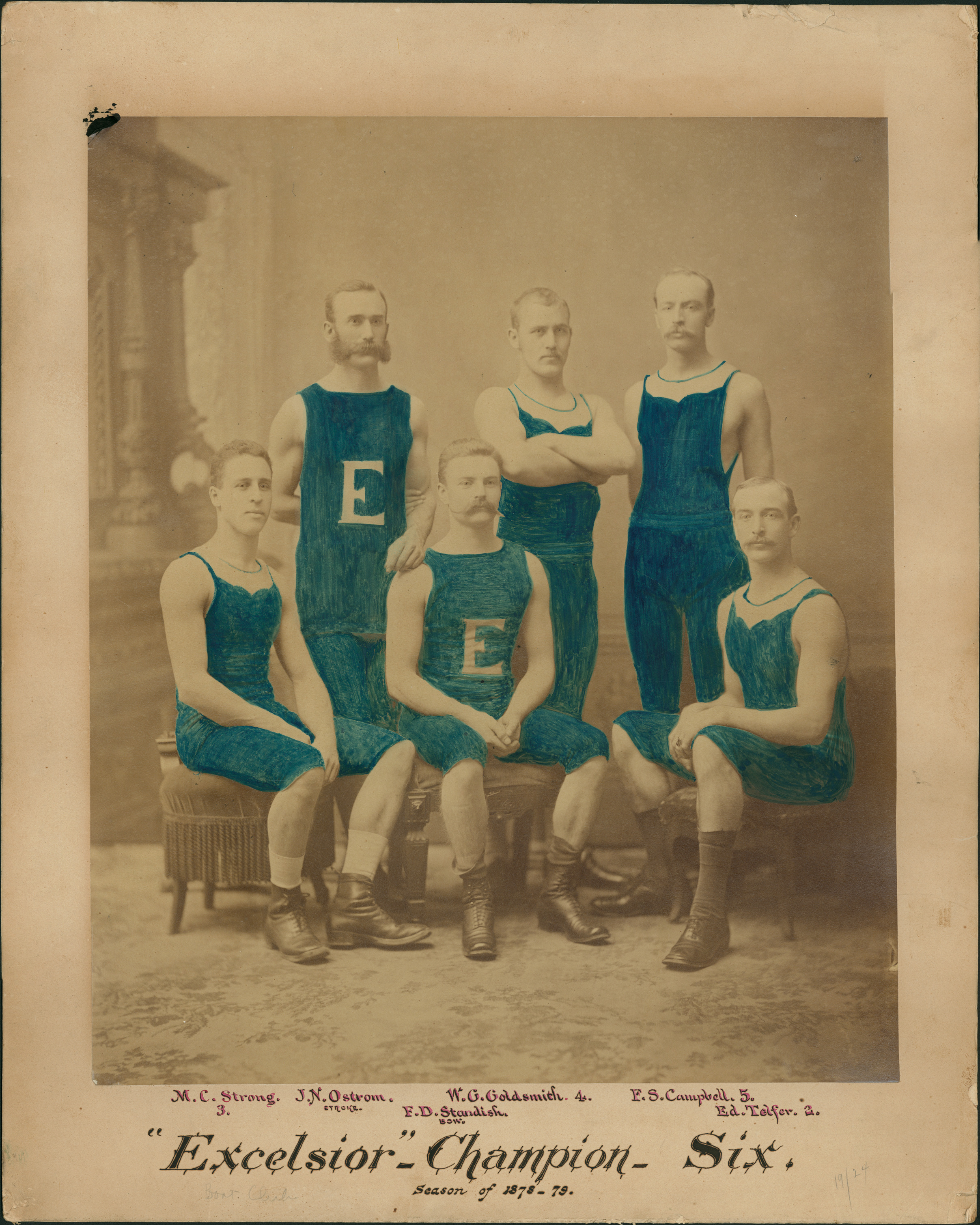 Group portrait of five men, wearing shorts and sleeveless shirts. Handwritten on front: "Excelsior Boat Club, champion six, season of 1878-79; M. C. Strong, 3., J. N. Ostrom, stroke, F. D. Standish, bow, W. G. Goldsmith, 4., F. S. Campbell, 5., Ed. Telfer, 2." Uniforms are painted blue in photograph.