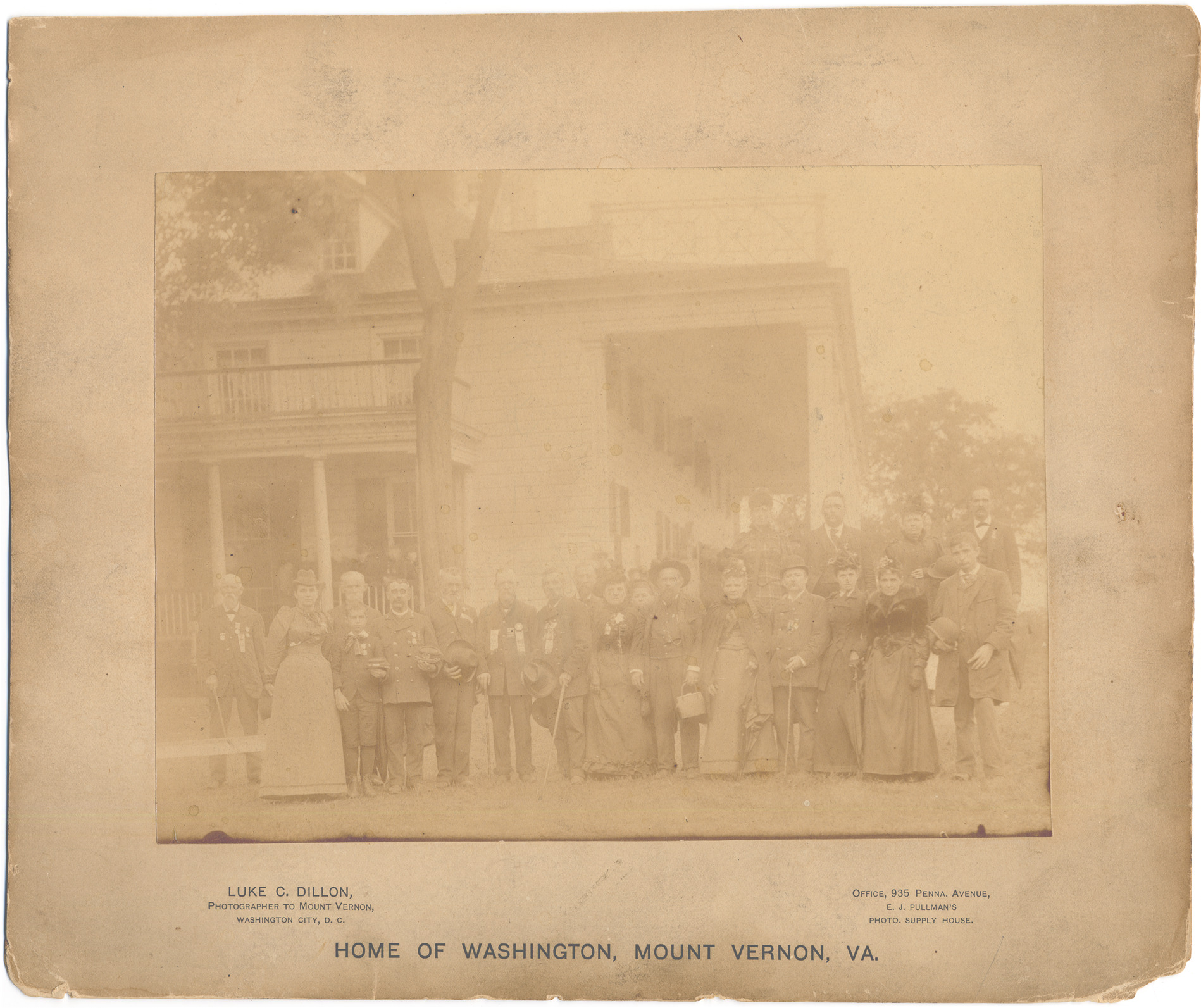 Group of men and women pose outside of Washington's home at Mount Vernon, Virginia; some men wear medals and ribbons pinned to their jackets; two men carry Civil War caps. Printed on front: "Home of Washington, Mount Vernon, Va.; Luke C. Dillon, photographer to Mount Vernon, Washington City, D.C.; office, 935 Penna. Avenue, E. J. Pullman's photo supply house." Handwritten on back: "John Griswold of Fairbanks Post in the photograph." Printed on back: "Orders for duplicates of photographic groups taken at Mount Vernon can be had by stating the day of the month and the number of the group. Luke C. Dillon, photographer to Mount Vernon, office at 935 Penna. Avenue, E. J. Pullman's photo supply house, P.O. Box 655, Washington City, D.C."