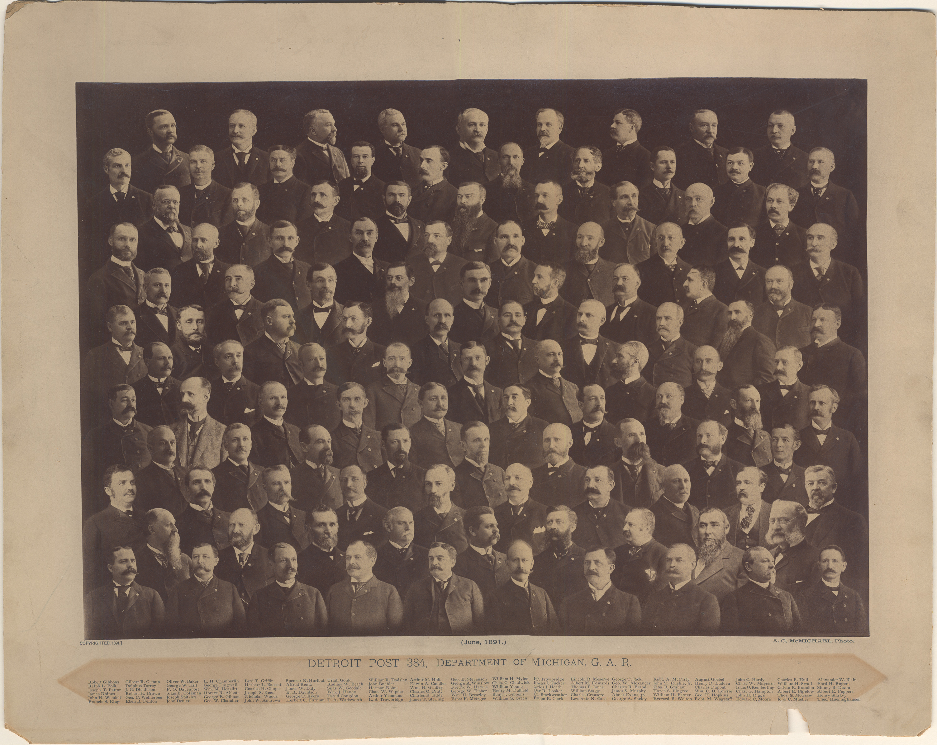 Individual portraits of members of the Grand Army of the Republic, arranged to resemble a group portrait. Printed on front: "Detroit Post 384, Department of Michigan, G.A.R., June, 1891, A. G. McMichael, photo." Printed on front is list of individuals in photograph. Photograph is torn and repaired with tape.