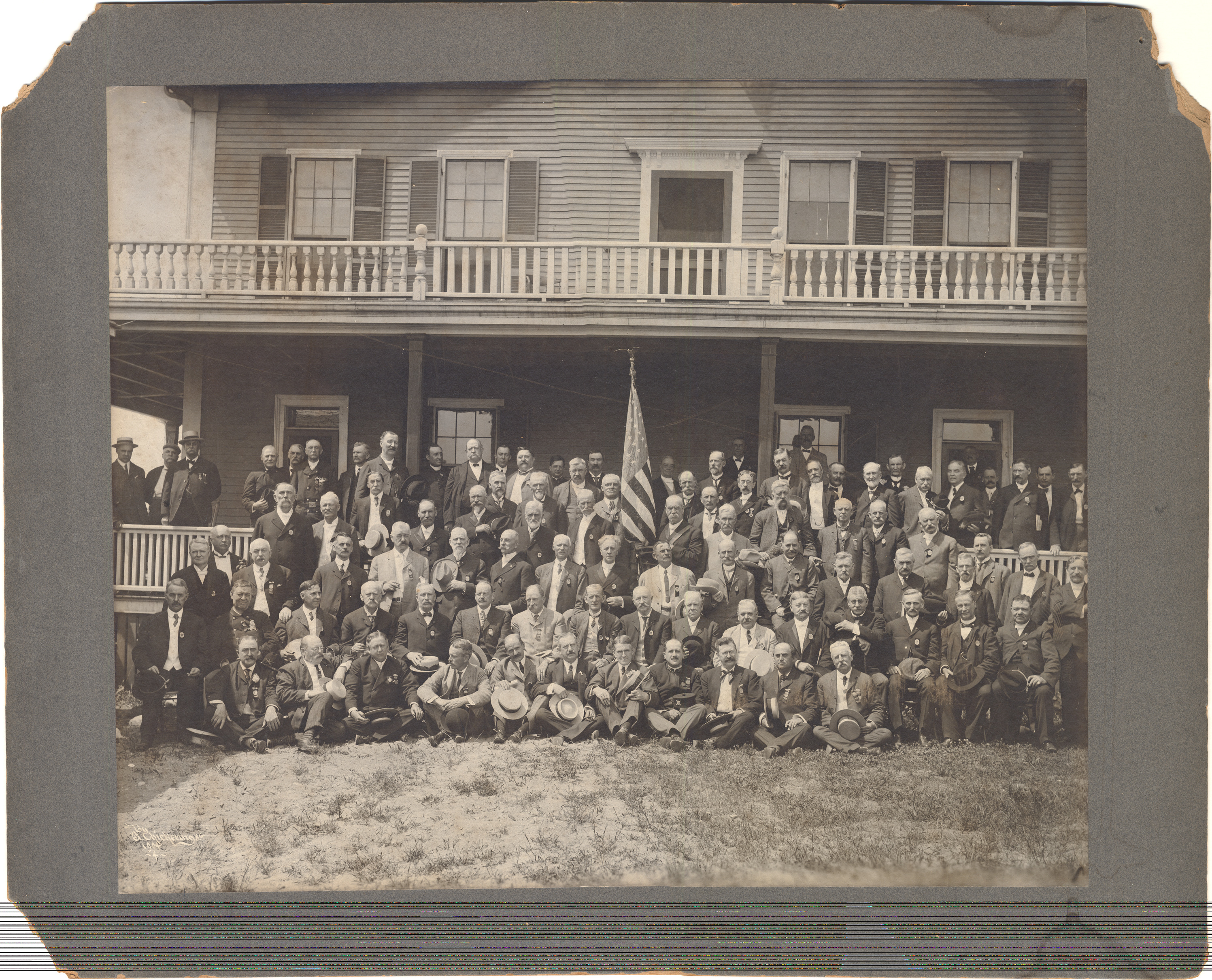 Group of men wearing suits pose in front of a two-story wooden-frame house; man in center holds American flag; men have ribbons pinned to their lapels. Printed on photograph: "By E. Chickering, 1904." Handwritten on back: "Detroit Post 384 at Boston, Thos. S. McGraw, commander." Handwritten on back of duplicate: "Post #384 at Point Shirley, Boston Harbor, August 15, 1904; Detroit Post 384 G.A.R. guests of the Boston Shoemens Association."