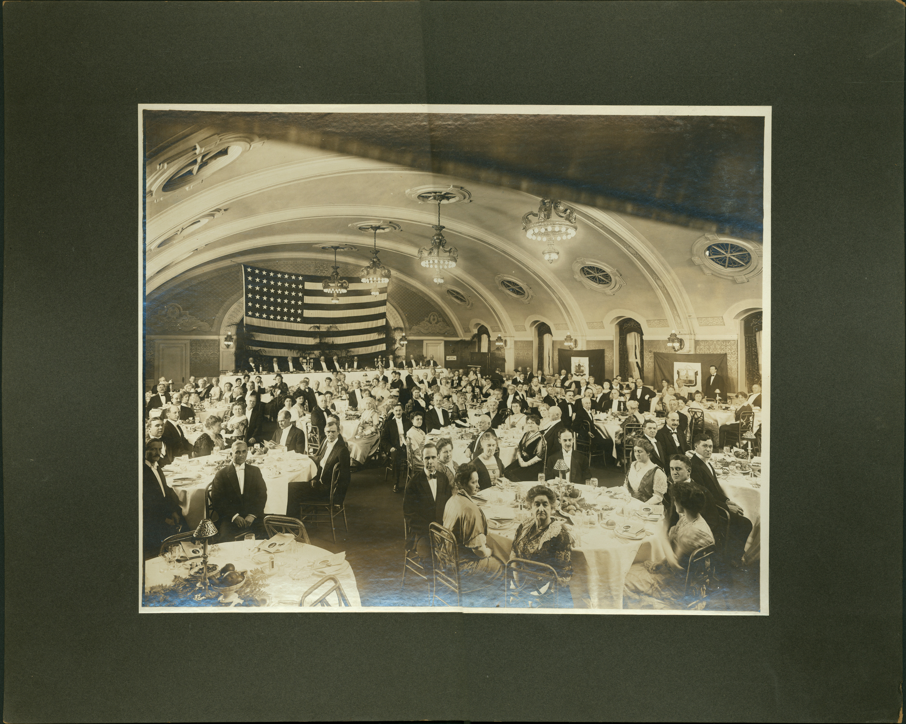 Men and women in evening dress sit at round tables in banquet hall; dignitaries sit at table or dais in front of room; American flag draped on wall; programs at each place setting. Handwritten on back: "New England Society, Dec. 19, 1914 at the Pontchartrain. Principal speaker, Hon. Wm. H. Taft."