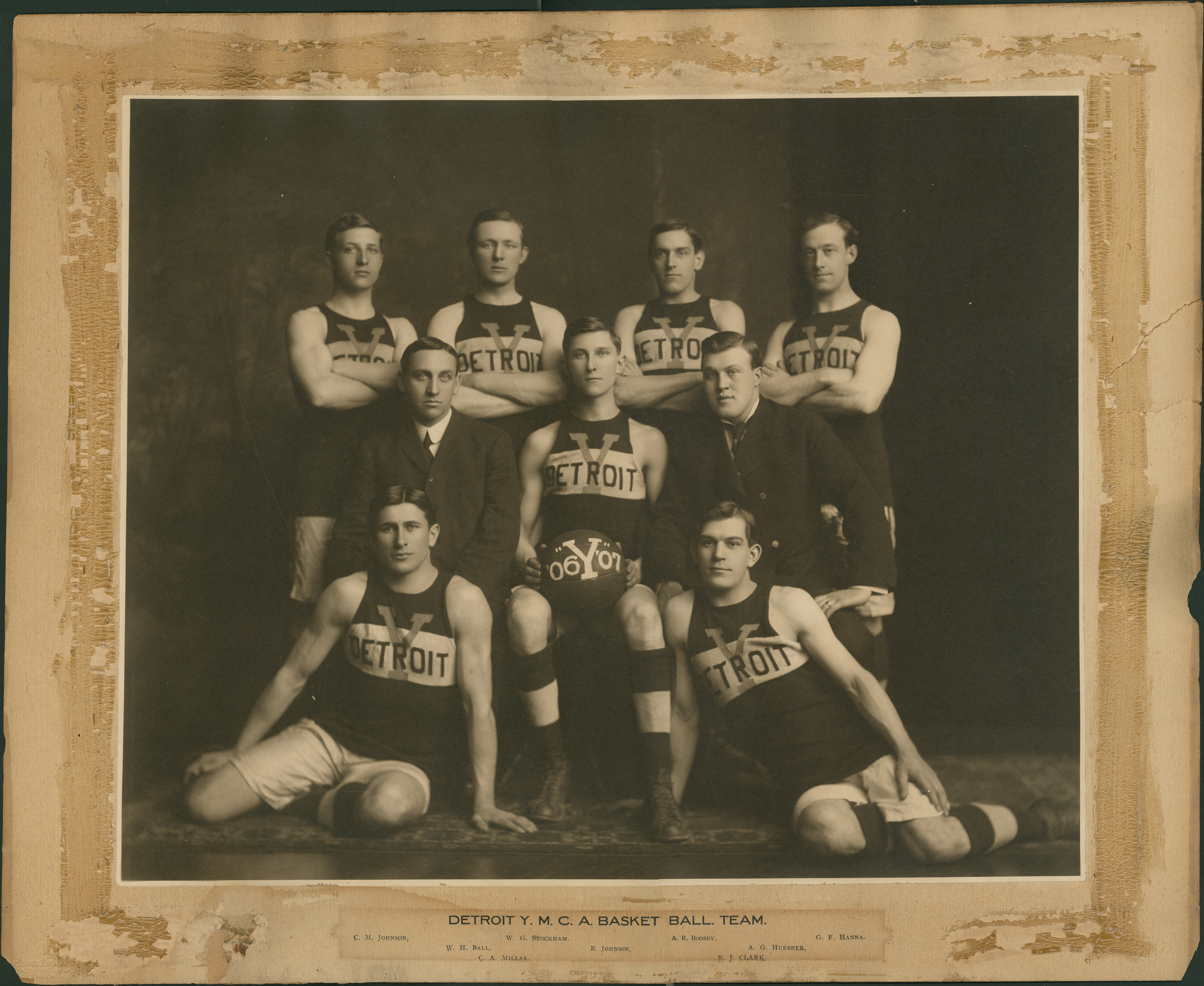 Members of Y.M.C.A. basketball team; players wear sleeveless shirts with "Y Detroit" on front; man in middle holds basketball; two men in center row wear suits. Basketball reads: "Y, '06-'07." Printed on front: "Detroit Y.M.C.A. basketball team; C.M. Johnson, W.G. Stockham, A.R. Boosey, G.F. Hanna, W.H. Ball, B. Johnson, A.G. Huebner, C.A. Millar, R.J. Clark."