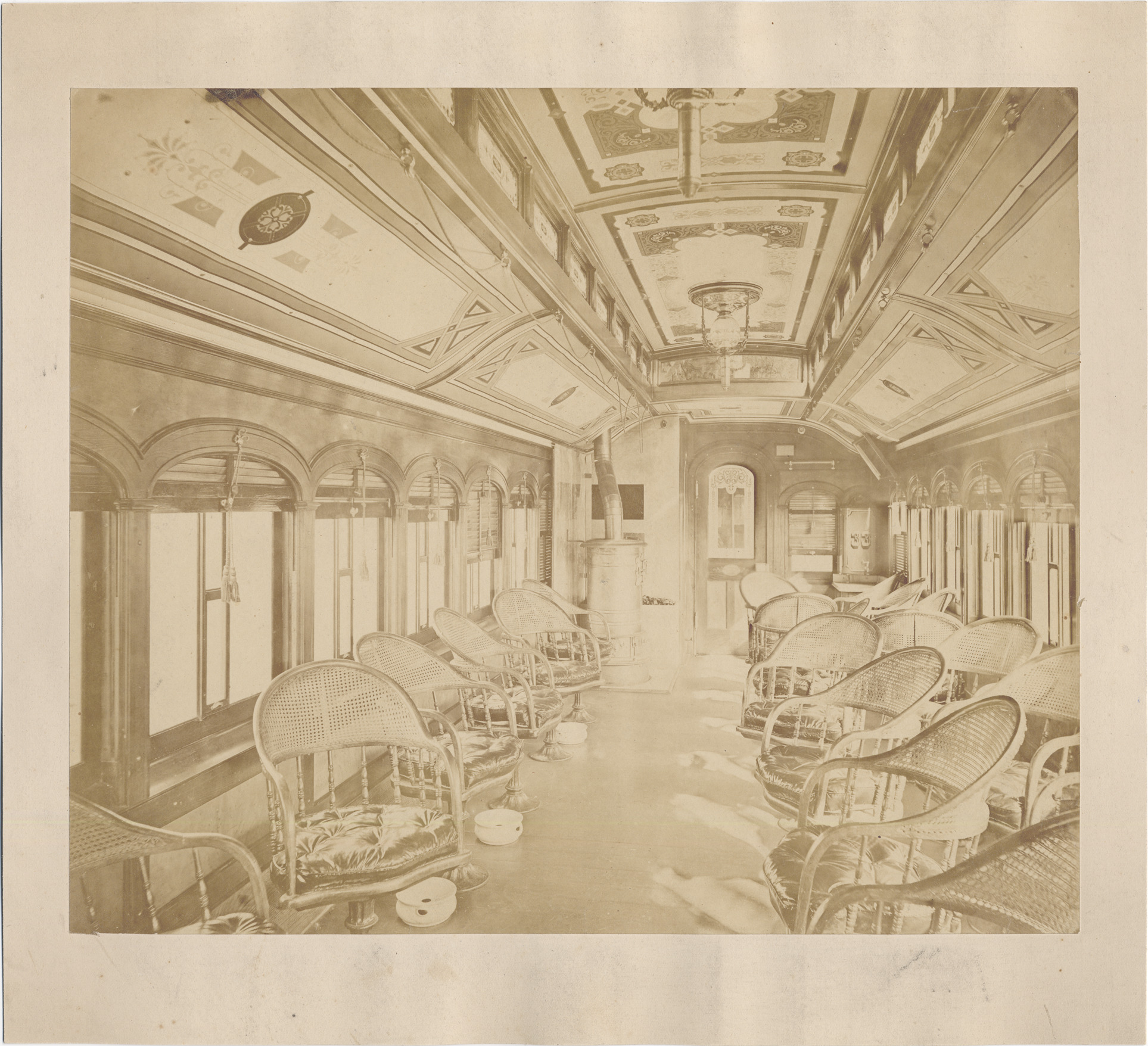 Favorite this☆ Michigan Central railroad car Description: Interior view of railroad car; wicker swivel chairs with seat cushions; ornate ceiling; arched windows. Details Resource ID: DPA5072 Subject: Railroad cars--Michigan--Detroit Michigan Central Railroad Company Albumen prints Photographic prints Date Issued: Unknown year Format: 1 photographic print mounted on stock ; image 9.5 x 11.25 in. Member of: Burton Historical Collection Filing Location: LD/Railroads-Michigan Central Rights: Physical rights are retained by DPL. Copyright is retained in accordance with U.S. copyright laws.