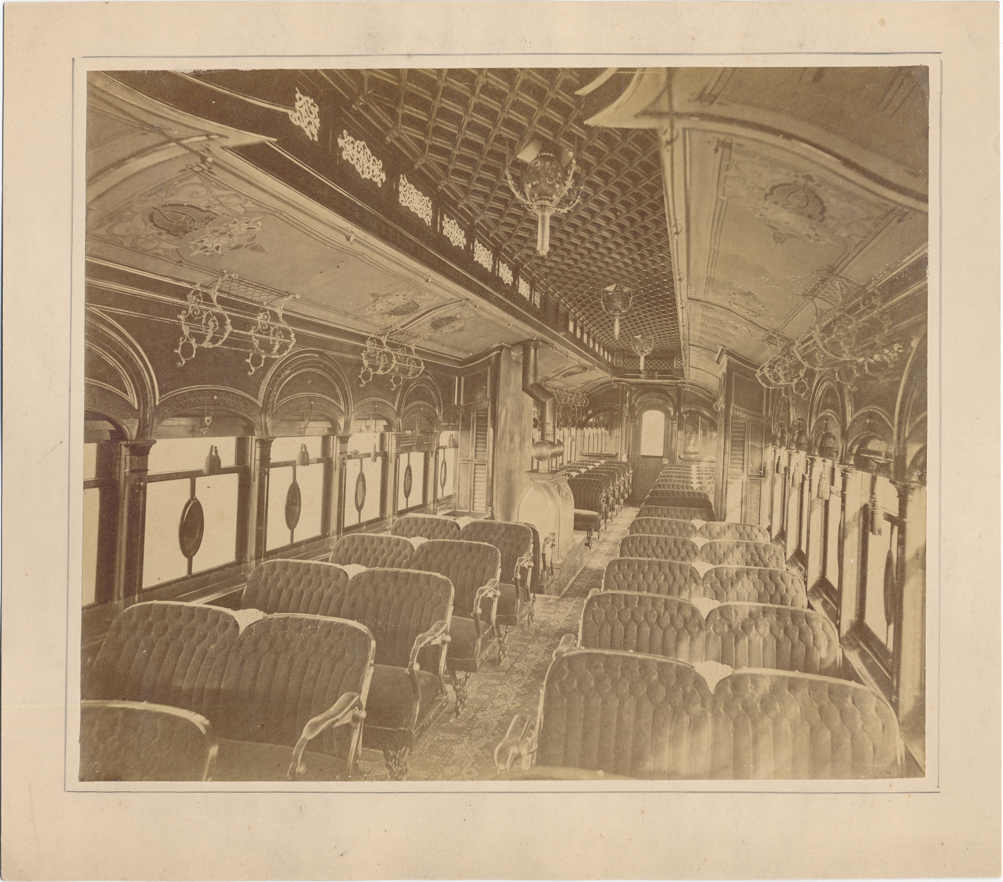 Favorite this☆ Michigan Central railroad car Description: Interior view of railroad car; coach seats have padded cushions; ornate patterned ceiling with light fixtures; carpet; heating stove in center of car. Details Resource ID: DPA5073 Subject: Railroad cars--Michigan--Detroit Michigan Central Railroad Company Albumen prints Photographic prints Date Issued: Unknown year Format: 1 photographic print mounted on stock ; image 9.5 x 11.25 in. Member of: Burton Historical Collection Filing Location: LD/Railroads-Michigan Central Rights: Physical rights are retained by DPL. Copyright is retained in accordance with U.S. copyright laws.