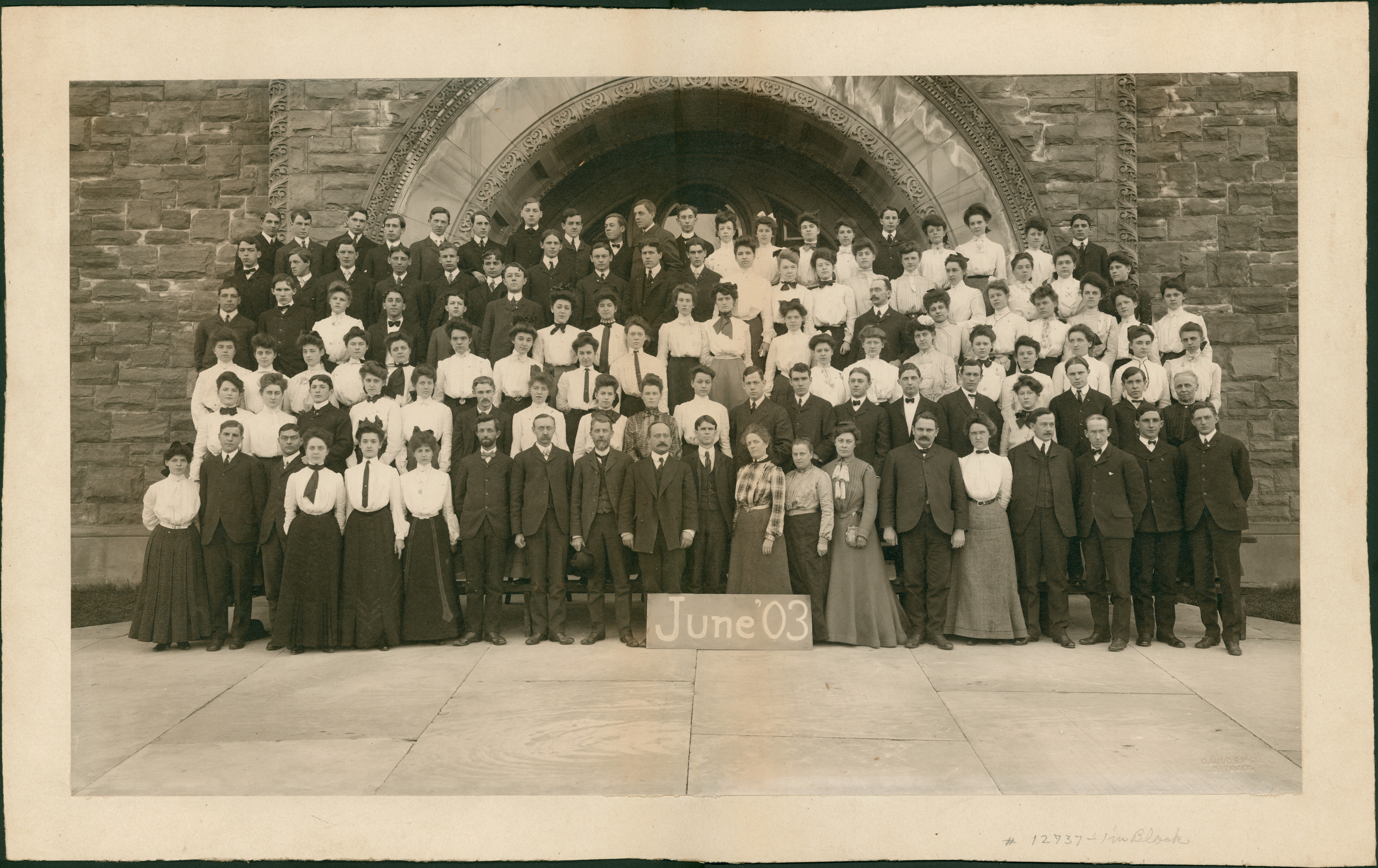 Group of high school students and teachers pose on steps in front of school entrance; sign in front of group: "June '03." Embossed on front: "C.M. Hayes & Co., Detroit." Handwritten on back of duplicate: "Central High School." Class photos for 1898, 1907, 1908, 1909, 1911, 1913, 1922 not digitized.