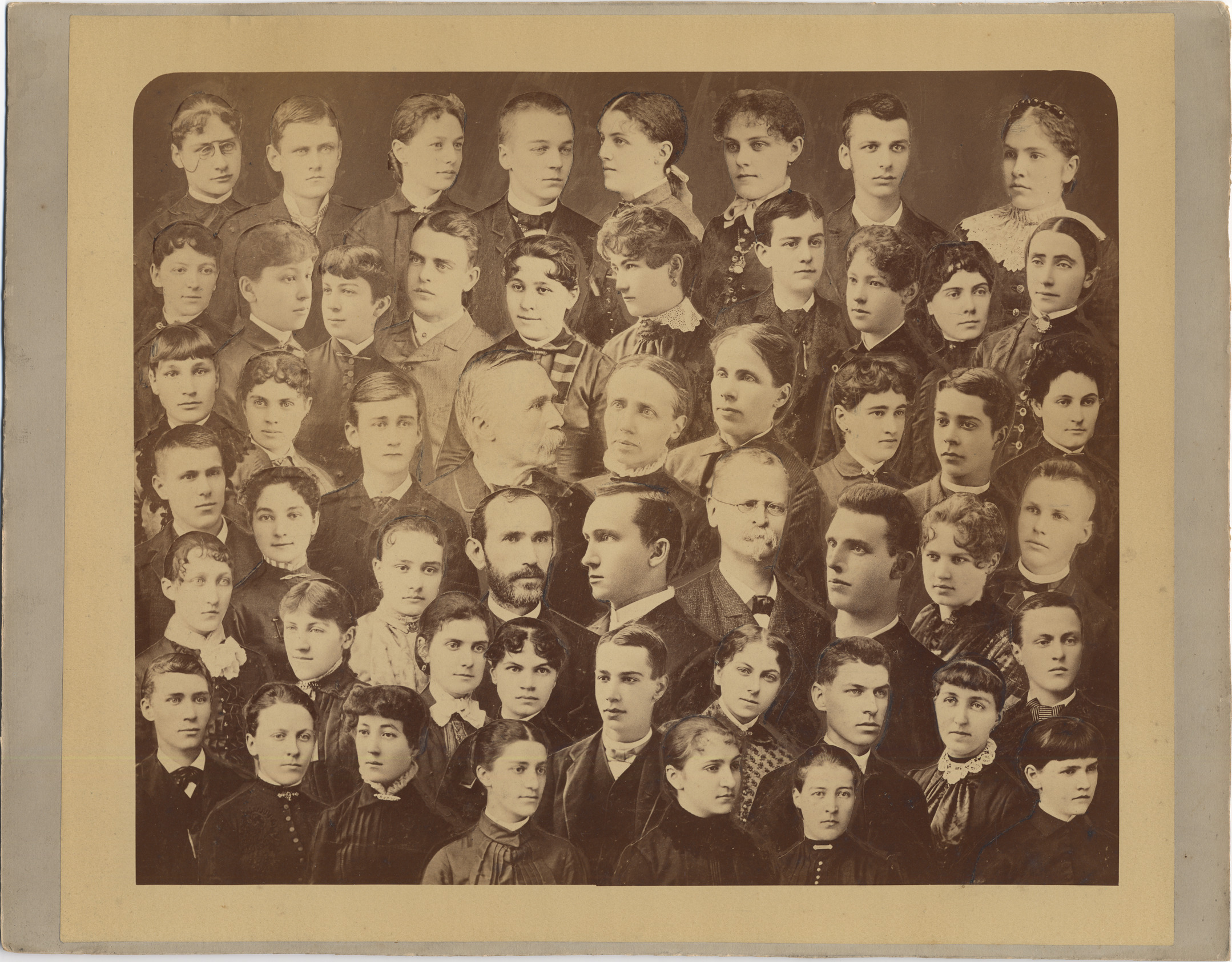 Individual portraits of students assembled to resemble group portrait. Handwritten on back: "In old Capitol building, class of June 1884; Wm. Livingston, no.1, left, Miss Thompson, Preston M. Hickey, Francis Leslie Stevenson, ... Hildner, Charles Miller, Prof. Sherrard, principal Lawrence C. Hull, Annie Smith, John Greusel, Fred Barber, Prof. Miller, Mrs. Bishop, Effie Durkee, Eddie Armstrong, ... Eaton, upper 4: Guy Kiefer, Willard Pope, ... Shaw, Treue Delbridge, these are as many as Mr. Stevenson could remember." Printed on front of duplicate: "Detroit High School, June class of '84."