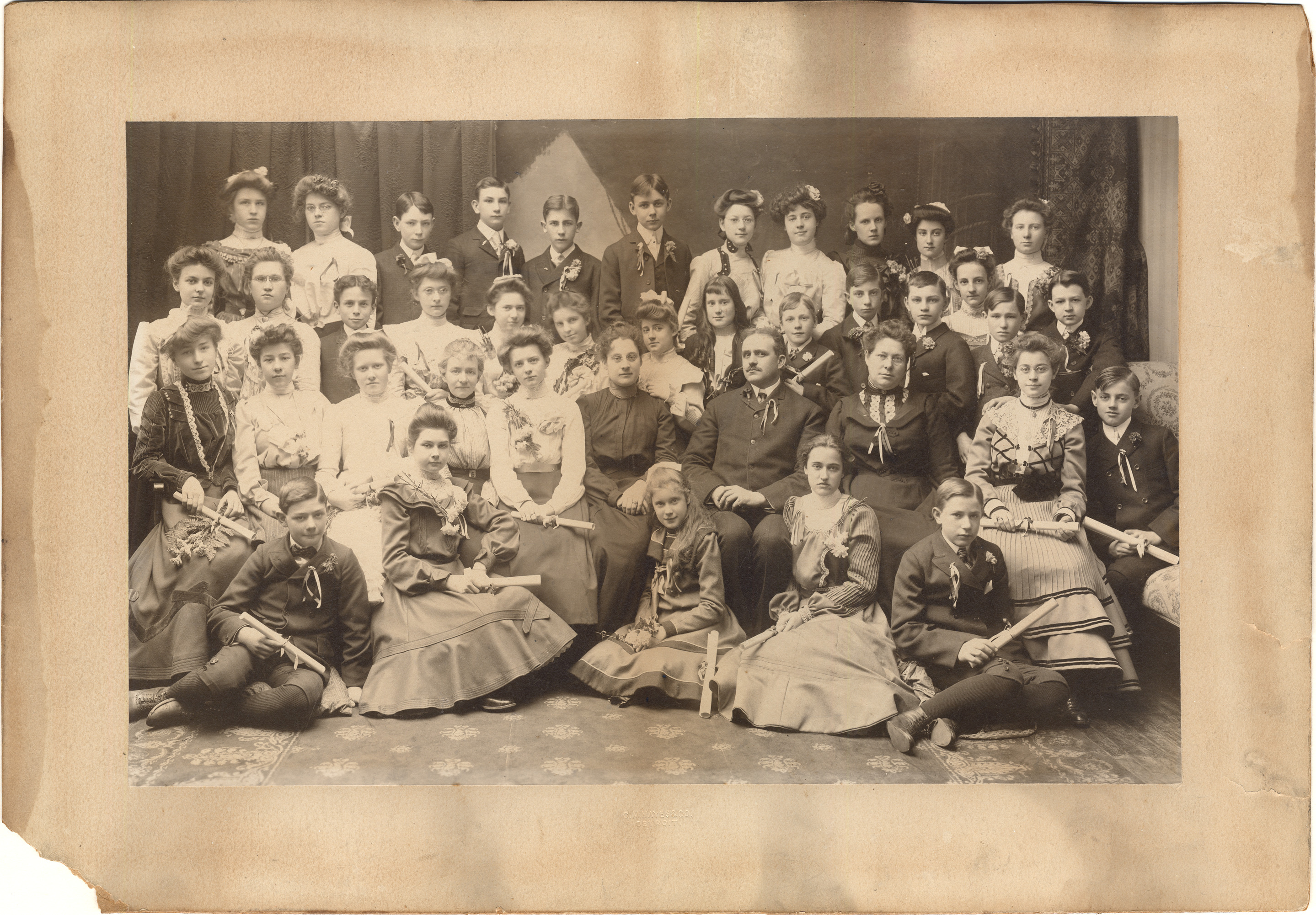 Favorite this☆ Webster School students Description: Group portrait of students and teachers; students hold diplomas tied with ribbon. Handwritten on back: "Webster School - Mr. Comfort, principal. Graduation picture of Harry M. Eason's class, January 31, 1902. Built in - on Twenty-first Street." Details Resource ID: DPA5152 Subject: School children--Michigan--Detroit Elementary teachers--Michigan--Detroit Portraits, Group--Michigan--Detroit Photographic prints Date Issued: 1902-01-31 Format: 1 photographic print mounted on mat board ; image 9.75 x 15.25 in. Member of: Burton Historical Collection Filing Location: LD/Schools-Webster Rights: Physical rights are retained by DPL. Copyright is retained in accordance with U.S. copyright laws.