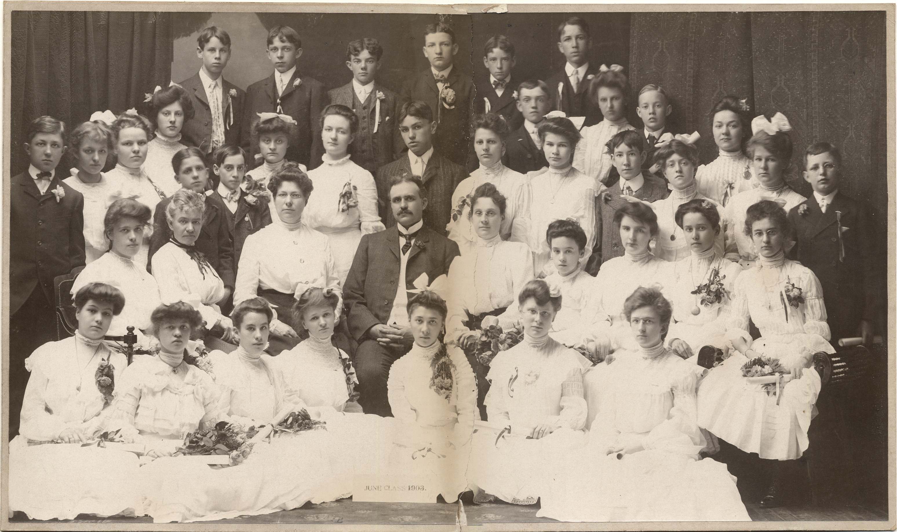 Group portrait of students and teachers; girls wear white lace dresses; boys wear suits; students hold diplomas tied with ribbon; sign in first row: "June class 1903." Handwritten on back: "21st Street, June 1903 graduation." Photograph is torn in half.