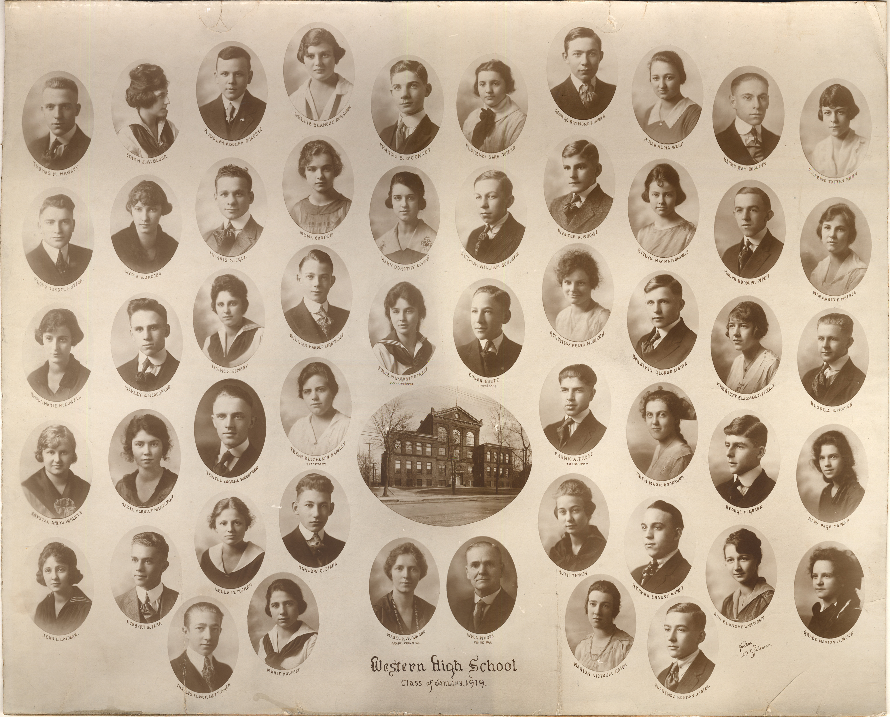 Individual portraits of students and principals; in center of image is photograph of multistory brick school building. Each portrait labeled with name of individual. Printed on front: "Western High School, class of January, 1919; photos by D.D. Spellman." Handwritten on back: "Western High School graduation picture of Marion Victoria Eason, year Jan. 1919. Presented by her daughter Marion Penny Marinello, Detroit. The old school was destroyed by fire, year 1935; Marion Eason, daughter of Aflred George Eason and Jane Eason."
