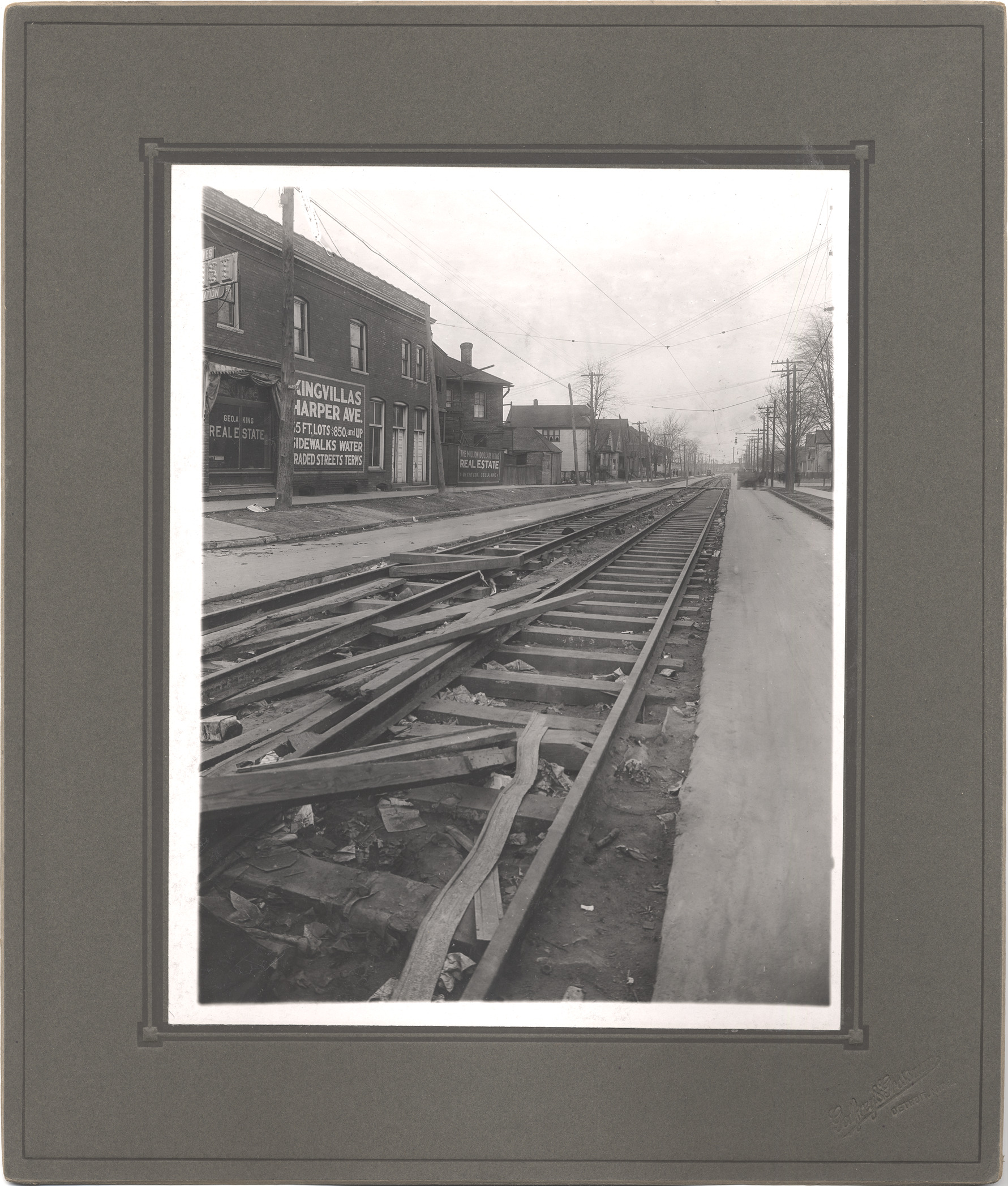 Favorite this☆ Railroad tracks Description: View of railroad tracks in street; one section of track is damaged; planks and other debris scattered over tracks; building next to tracks is Geo. A. King real estate. Embossed on front: "Godfrey & Grossman, Detroit, Mich." Details Resource ID: DPA5170 Creator: Godfrey & Grossman Subject: Street-railroad tracks--Michigan--Detroit Photographers--Michigan--Detroit Photographic prints Date Issued: Unknown year Format: 1 photographic print mounted on mat board ; image 10 x 8 in. Member of: Burton Historical Collection Filing Location: LD/Street railroads Rights: Physical rights are retained by DPL. Copyright is retained in accordance with U.S. copyright laws.