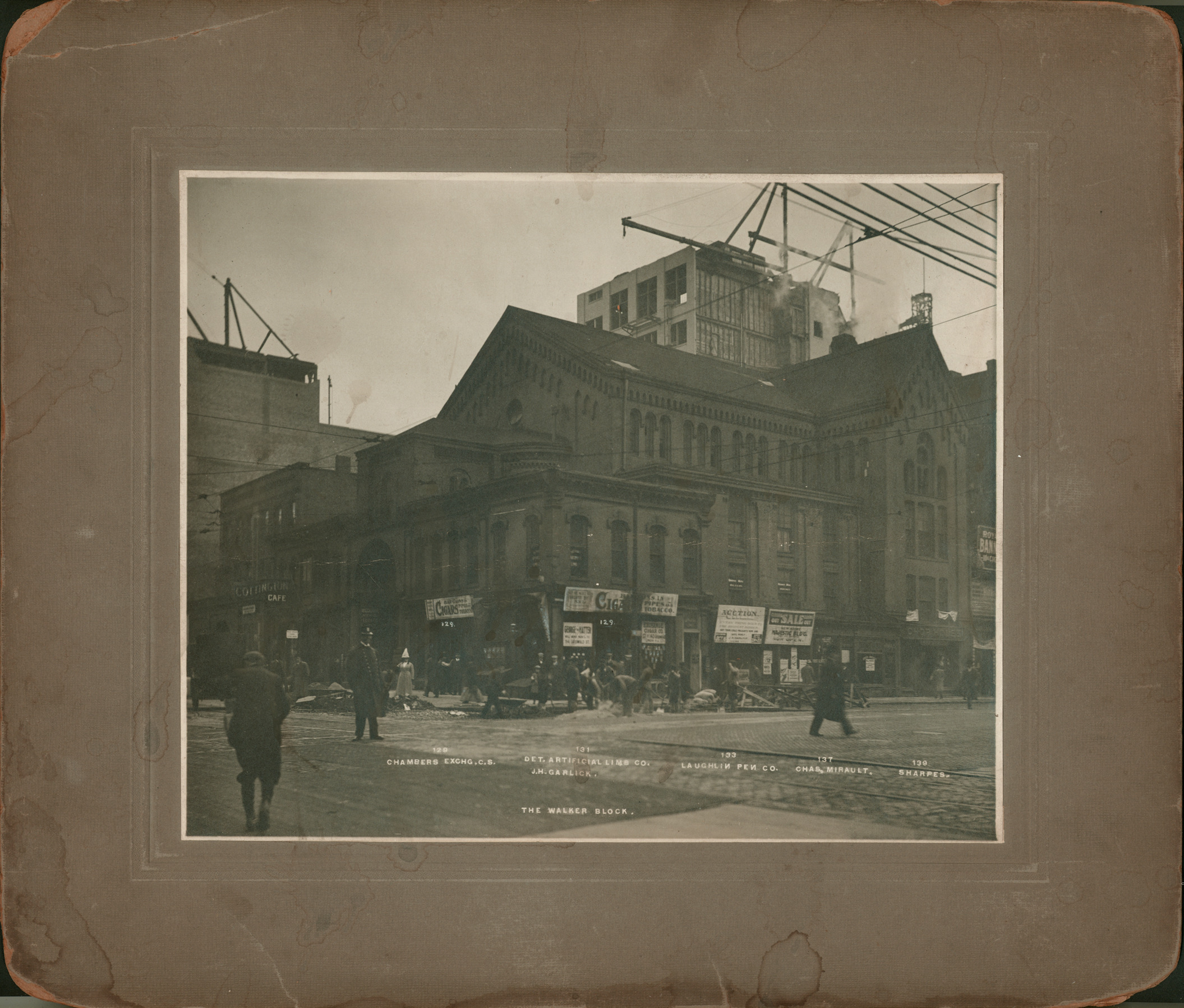 View of the Walker Block at Griswold and Fort; large brick building with storefronts; decorative brickwork near roof. Men working at street repair on corner; policeman stands in street. Printed on photograph: "129, Chambers Exchg. C.S., 131 Det. Artificial Limb Co., J.H. Garlick, 133, Laughlin Pen Co., 137, Chas. Mirault, 139, Sharpes; the Walker Block." Two building entrances labeled with "129" in white paint. Handwritten on back: "Near Fort, about 1907." Stamped on back: "H.C. Lewis, photographer, phone West 2505, 466 Fifteenth St., Detroit, Mich."