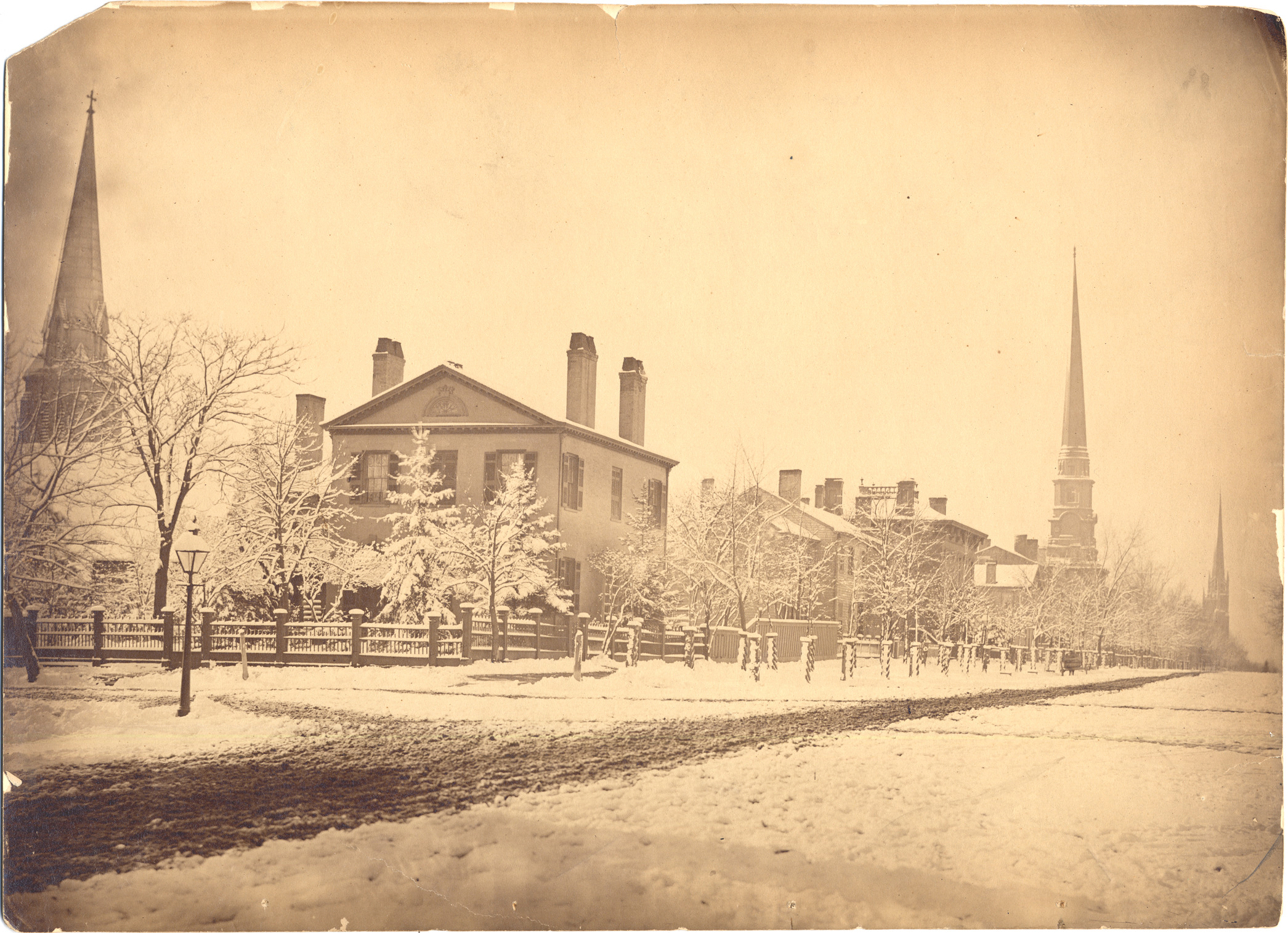 View of houses at the corner of Griswold and Fort during winter; church spires in background; label on back: "View of Fort Street, south side, from the corner of Griwold street to Third Street. The house in the foreground stands on the site of the Moffat Block. It was built by John Palmer in 1829. At that time James Williams built a large brick house adjoing the Palmer place on the south, which was on Ground covered by the southern end of the Moffat Block. Next beyond the Palmer House stood the home of Judge C. I. Walker and next came the house of James Penny. The mansion of David Thompson with its fine grounds, floral garden and fountain stood on the southeast corner of Fort and Shleby. On the southwest corner of Fort and Shelby was the home of Thomas Palmer. Adjoining it was the home of John Owen. The First Congregational Church, erected and dedicated in 1854 and vacated in 1891, stood at the southwest corner of Wayne & Fort. The spire was removed and the building became the home of the Detroit Journal and a new section was added to the front. In the distance at the extreme right is the Fort Street Presbyterian Church, finished and dedicated in 1855 and although twice damaged by fire it is still one of the most attractive churches of Detroit. At the extreme left the spire of St. Paul's Episcopal church rises from the northeast corner of Congress and Shelby streets. This was dedicated in 1855. All three of these churches were under construction at the same time."