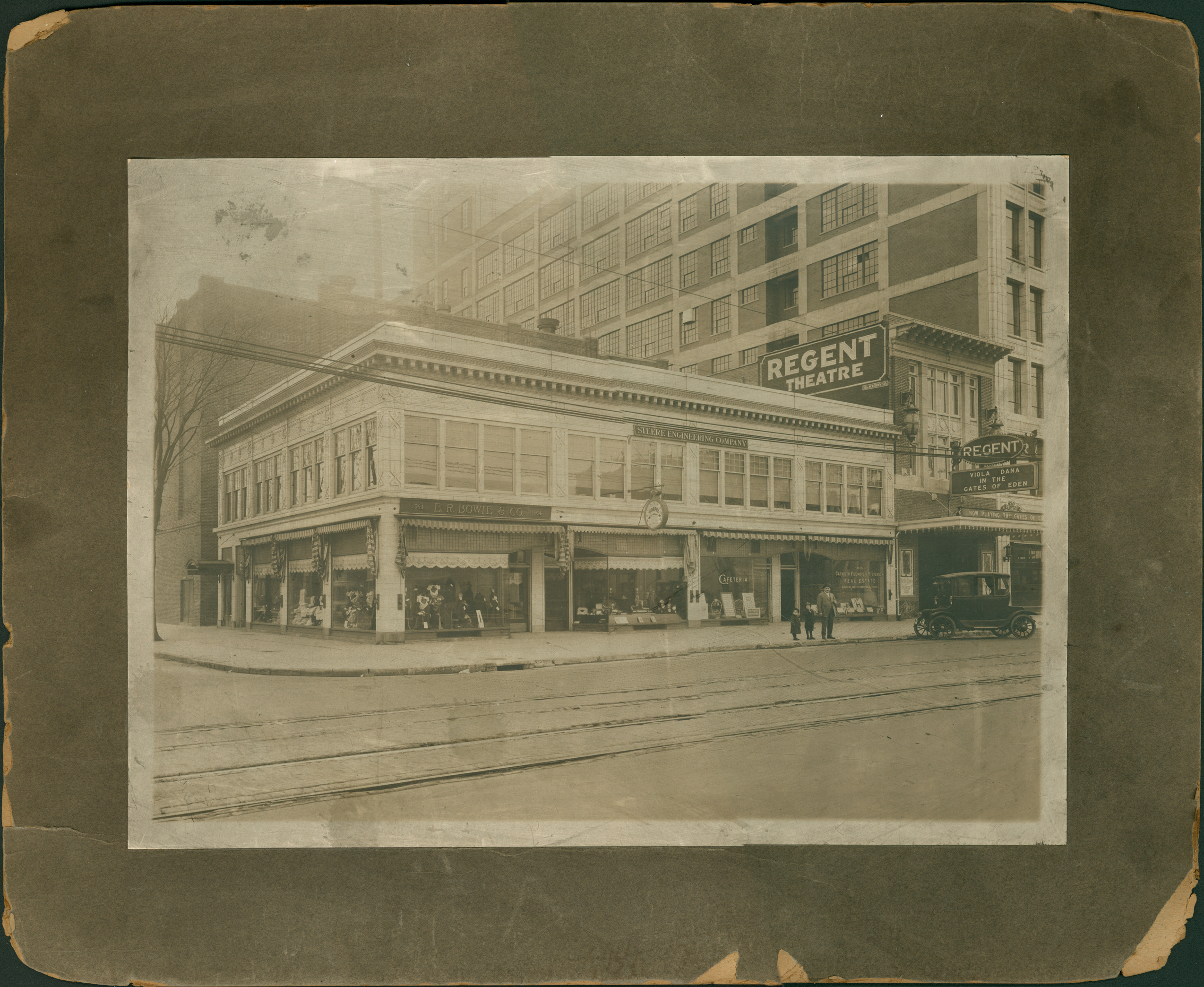 View of buildings at corner of Woodward and East Grand Boulevard. Two-story building with decorative cornice; second floor is Steere Engineering Company; storefronts on ground level are E.R. Bowie & Co. and Carvolth Fillmore & Stevenson real estate; building next door is Regent Theatre. Automobile parked on street; man and two children stand on sidewalk. Embossed on front: "Chas. Rolf Messinger, Detroit." Handwritten on back: "Woodward and E. Grand Blvd., Regent Theatre, Basso bldg., tall building Stormfelz bldg."