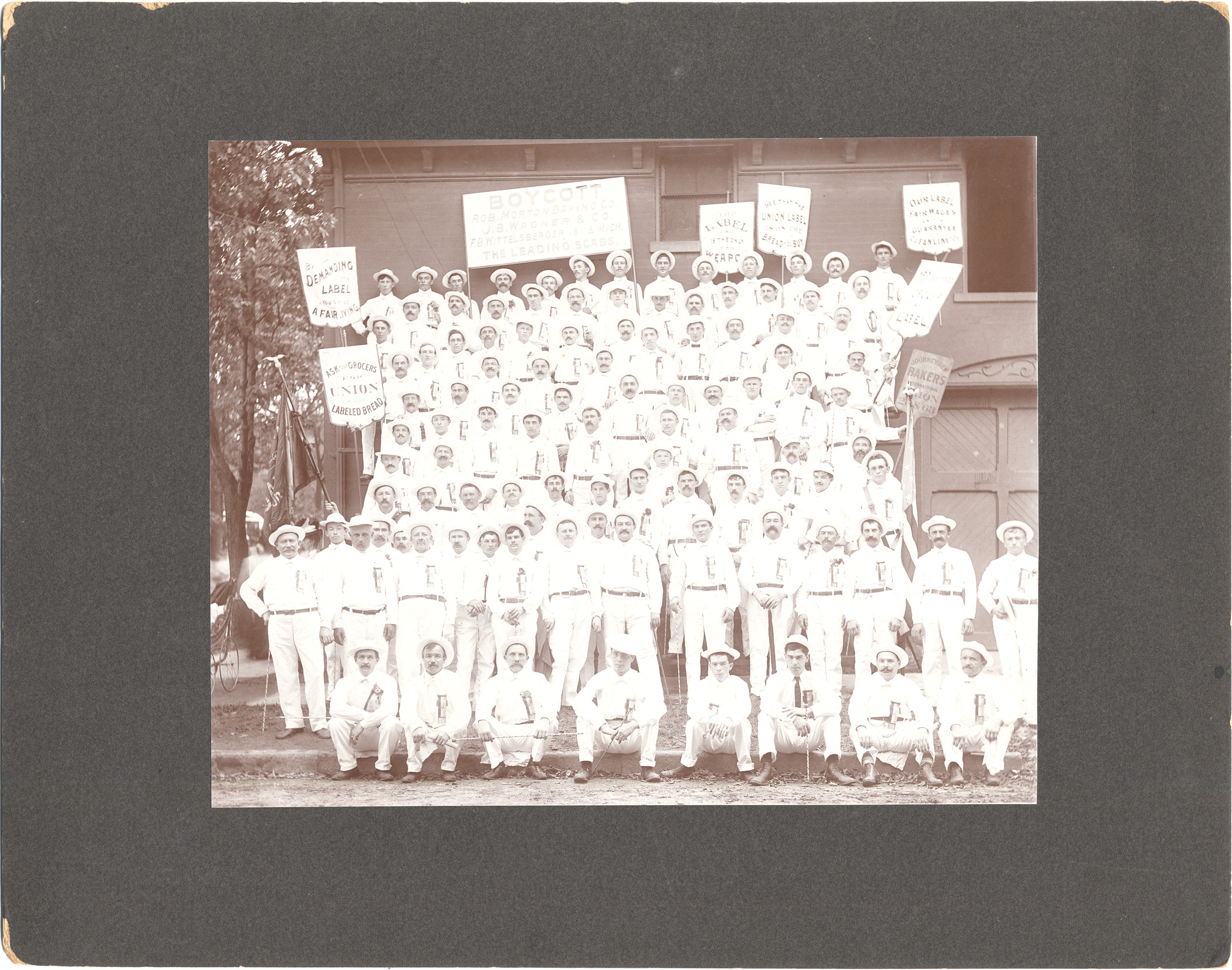Group of men, wearing white pants, shirts and hat, pose outside building holding signs; men have ribbons pinned to their shirts and hold striped batons; signs read: "Ask the grocers for union labeled bread; boycott Rob Morton Baking Co., J. B. Wagner & Co., F. B. Wittelsberger, 18th and Mich., the leading scabs; the label is the only weapon; see that the union label is on the bread you buy; our label, fair wages ... guarantee cleanliness; Journeyman Bakers International Union."