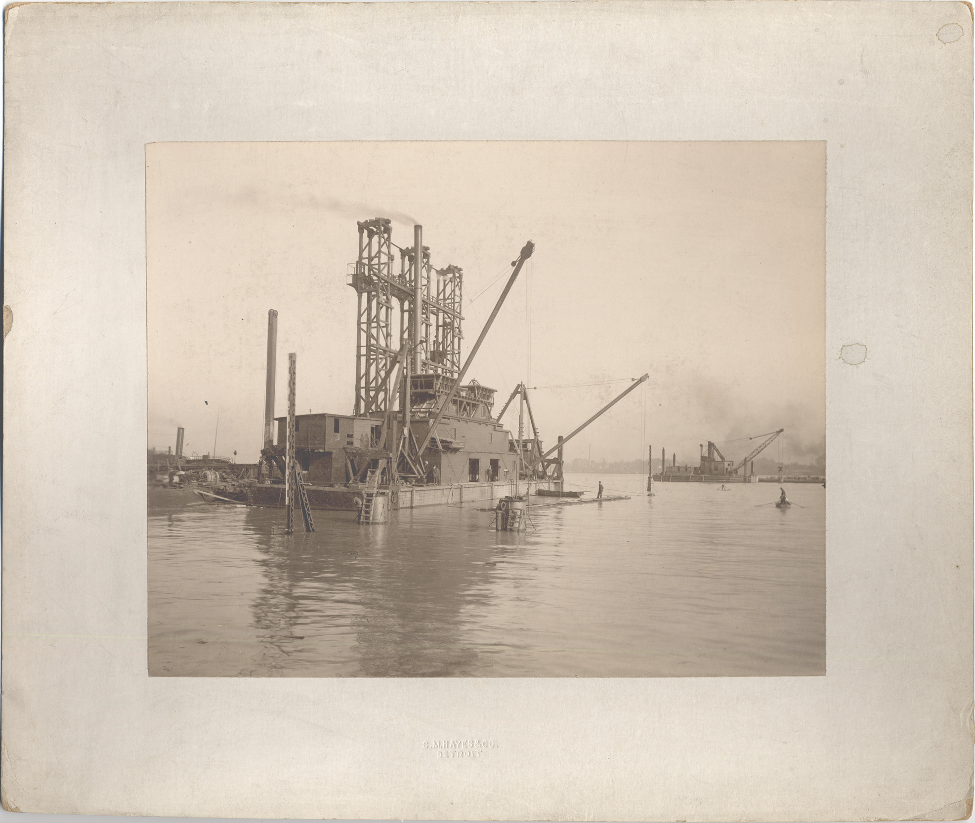 Favorite this☆ Construction of Michigan Central tunnel Description: Floating platform on the water, holding cranes and other equipment; man stands on floating dock next to platform; another platform in background. Embossed on front: "C.M. Hayes & Co., Detroit." Details Resource ID: DPA5211 Creator: Hayes, Clarence M. Subject: Michigan Central Railroad Company Railroad tunnels--Design and construction Offshore structures--Michigan--Detroit Photographers--Michigan--Detroit Photographic prints Date Issued: 1909 to 1910 Format: 1 photographic print mounted on mat board ; image 7.25 x 9.25 in. Member of: Burton Historical Collection Filing Location: LD/Tunnels and tunneling Rights: Physical rights are retained by DPL. Copyright is retained in accordance with U.S. copyright laws.