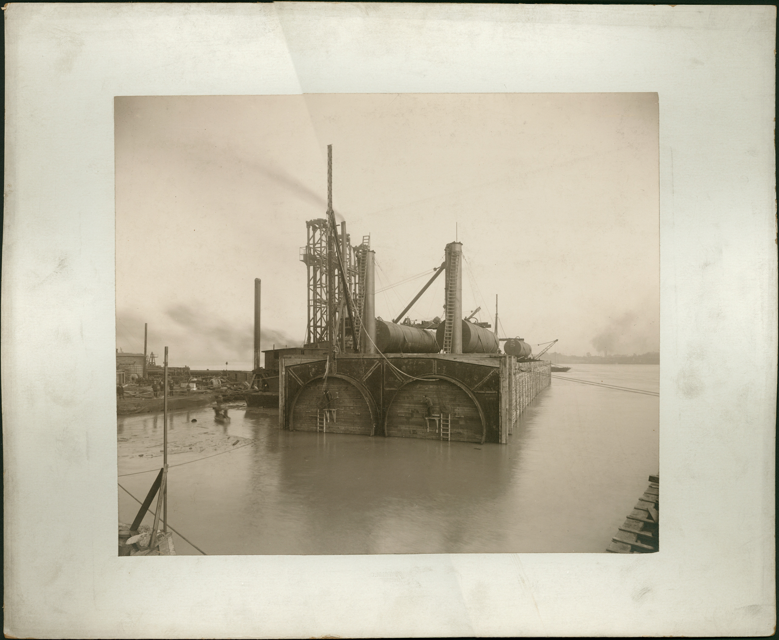 Favorite this☆ Construction of Michigan Central tunnel Description: View of machinery and equipment on floating platform; large pipes or cylinders on platform; two men stand on supports attached to platform. Embossed on front: "C.M. Hayes & Co., Detroit." Details Resource ID: DPA5221 Creator: Hayes, Clarence M. Subject: Michigan Central Railroad Company Offshore structures--Michigan--Detroit Railroad tunnels--Design and construction Photographers--Michigan--Detroit Photographic prints Date Issued: 1909 to 1910 Format: 1 photographic print mounted on mat board ; image 10 x 12 in. Member of: Burton Historical Collection Filing Location: LD/Tunnels and tunneling Rights: Physical rights are retained by DPL. Copyright is retained in accordance with U.S. copyright laws.
