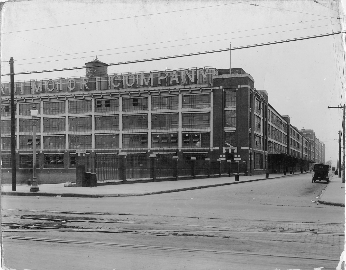 View of Ford Motor Company Highland Park factory located at Woodward and Manchester showing front exterior of building.