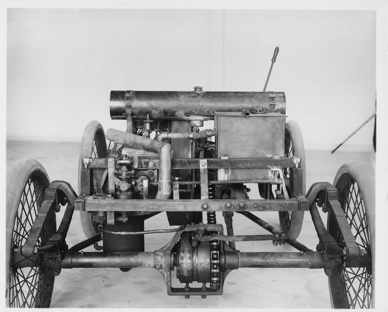 Photograph from glass negative of chassis of 1899 Packard Number One. Inscribed on photo back: "Completed Nov. 6, 1899, Warren Ohio; Model A, 1-cylinder, 9-horsepower, 71.5-inch wheelbase, 2-person roadster. Note that the H-gate shift box is in place, having been installed after initial tests of Nov. 1899 (initially there were 2 levers). Photograph was perhaps taken some years after car was built--note less than new condition of engine parts and tires."