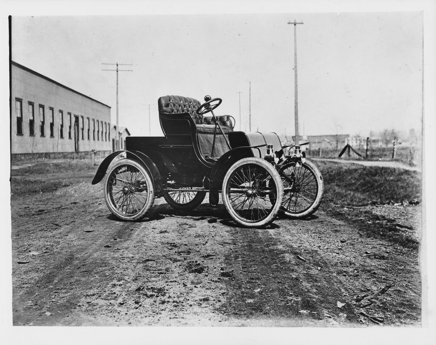 View of a 1901 Packard Model C parked outside. Inscribed on photo back: "1-cylinder, 12-horsepower, 75-inch wheelbase, 2-person roadster."