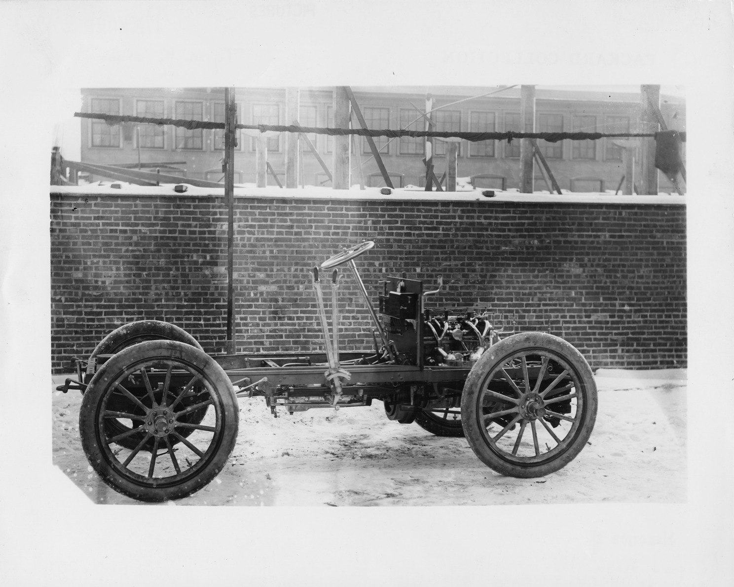 View copied from glass negative of 1903 Packard Model K bare chassis. Inscribed on photo back: "4-cylinder, 24-horsepower, 92-inch wheelbase. Photographed at the Packard plant, Warren, Ohio plant with two-story wooden building in the background. This was the first 4-cylinder car that Packard made, cost $7000, were approximately 7 built and the Gray Wolf used this engine."