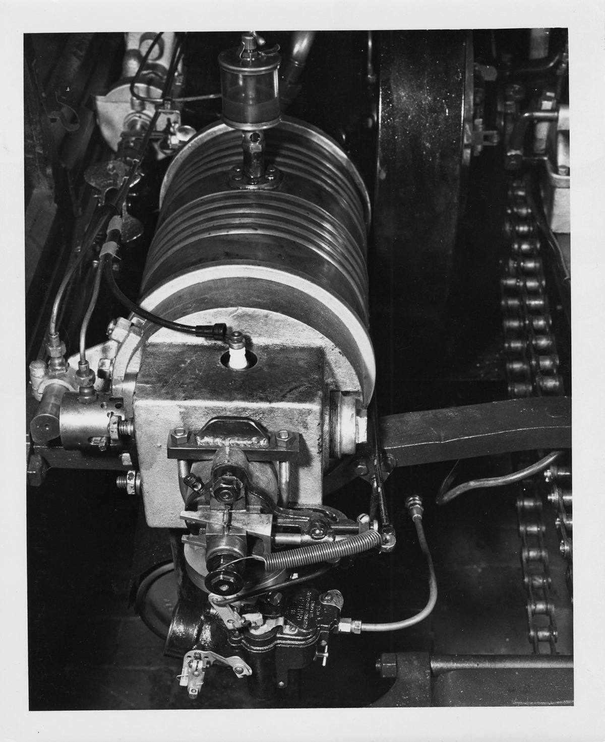Packard Co. file photograph, copy of original print, of 1903 Packard Model F carburetor. Inscribed on photo back: "Carburetor of 1-cylinder, 12-horsepower, 88-inch wheelbase, 2-person roadster. Close-up picture of the Carter carburetor that was used on "Old Pacific" during the transcontinental crossing from New York to San Francisco June 20th-August 21st, 1903, a total of 5600 miles. Driver Tom Fetch, from Packard plant in Warren, Ohio, passenger Marius C. Krarup, editor, The Automobile."