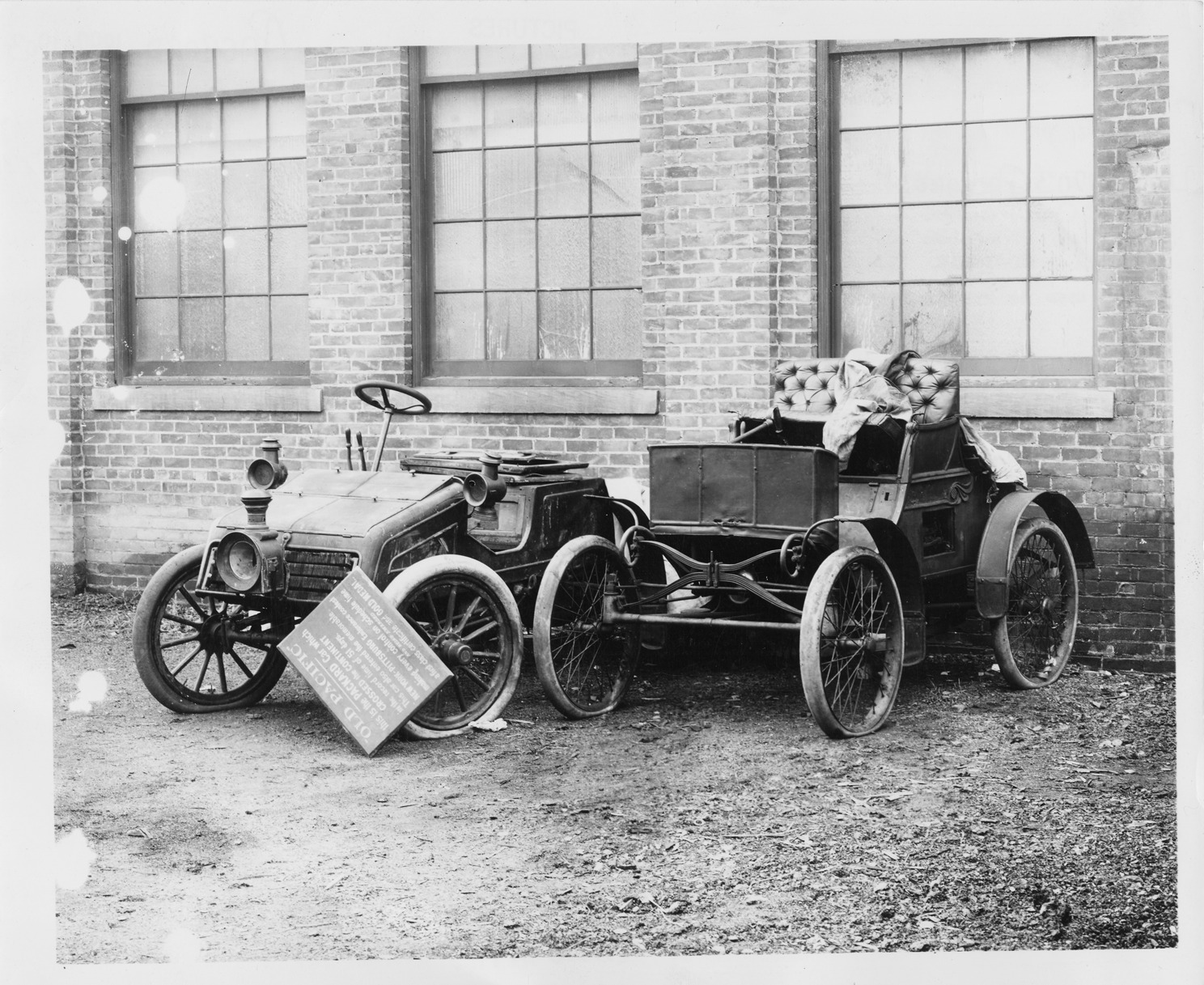 Photograph from glass negative of the 1903 Packard Model F and 1899 Model A in front of brick building. Inscribed on photo back: "1-cylinder, 12-horsepower, 88-inch wheelbase, 2-person roadster "Old Pacific," participant in the transcontinental crossing June 20th thru August 21st, 1903 from San Francisco to New York, driver E.T. (Tom) Fetch from the Packard Warren, Ohio plant and passenger Marius C. Krarup editor of The Automobile, rear deck passenger from Reno to Colorado Springs only, N.O. Allyn. This model also participated in the First Annual Endurance Contest of the NAAM from New York to Pittsburgh 7-15th of October, 1903 as contestant #16 class D, driver E.T. Fetch and observer C.H. Lowe and achieved a perfect score. To the right of "Old Pacific" is the first Packard, the 1899 Model A completed 11-06-1899 in Warren, Ohio, body by Morgan & Williams (carriage manufacturers) Warren, Ohio."